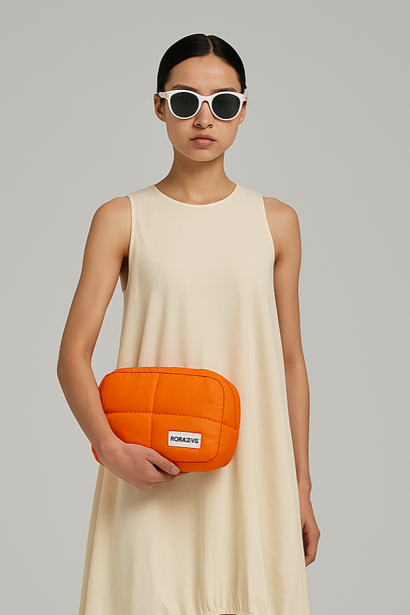 When the city heats up, go bold. The Post Card Bubble Travel Pouch in Neon Orange adds instant pit-lane punch, while Sabrina Goh’s airy parachute dress keeps you cool and comfortable in Singapore’s humidity. Pair it with Rocket Eyewear’s white sunnies—sharp enough for trackside glare, sleek enough for post-race drinks.