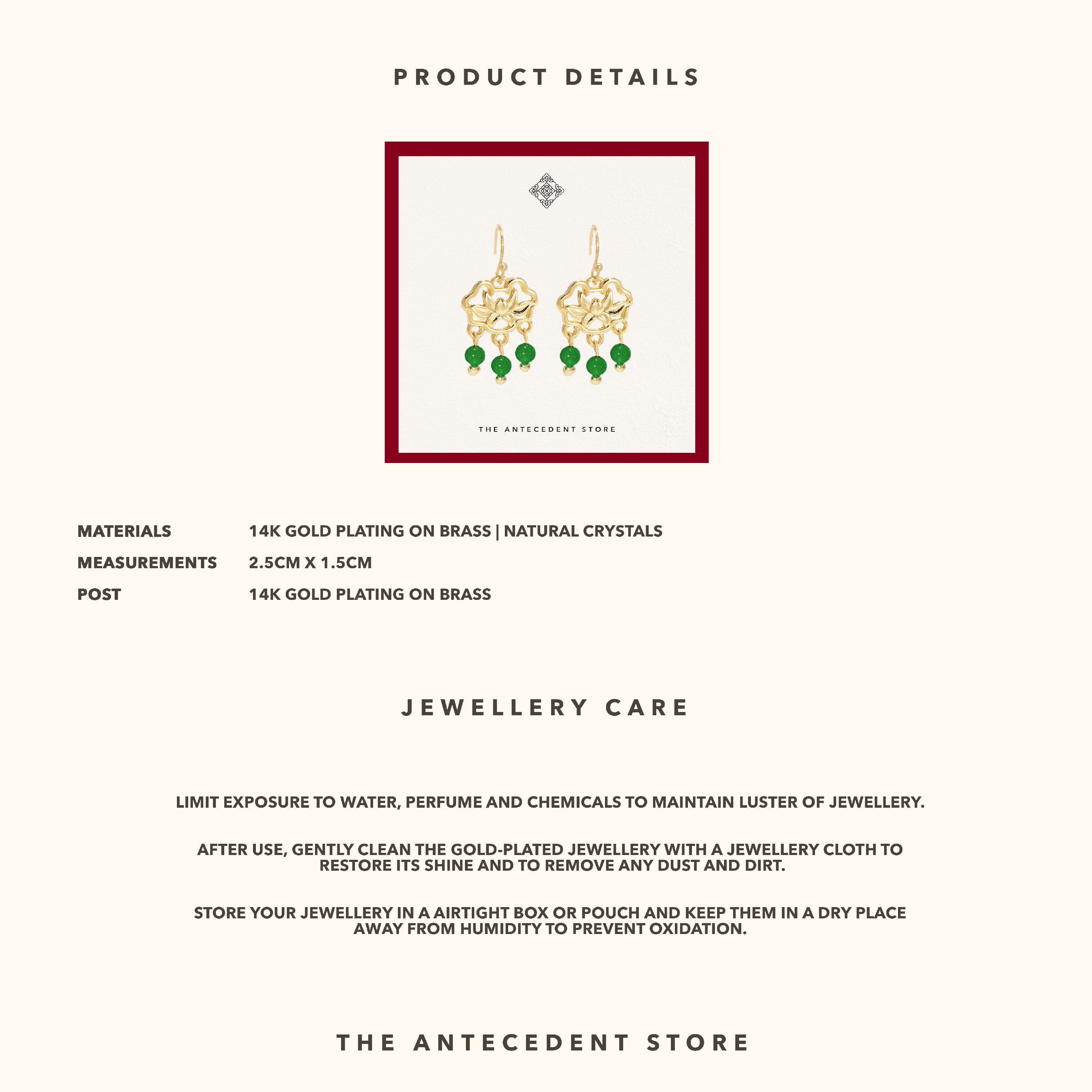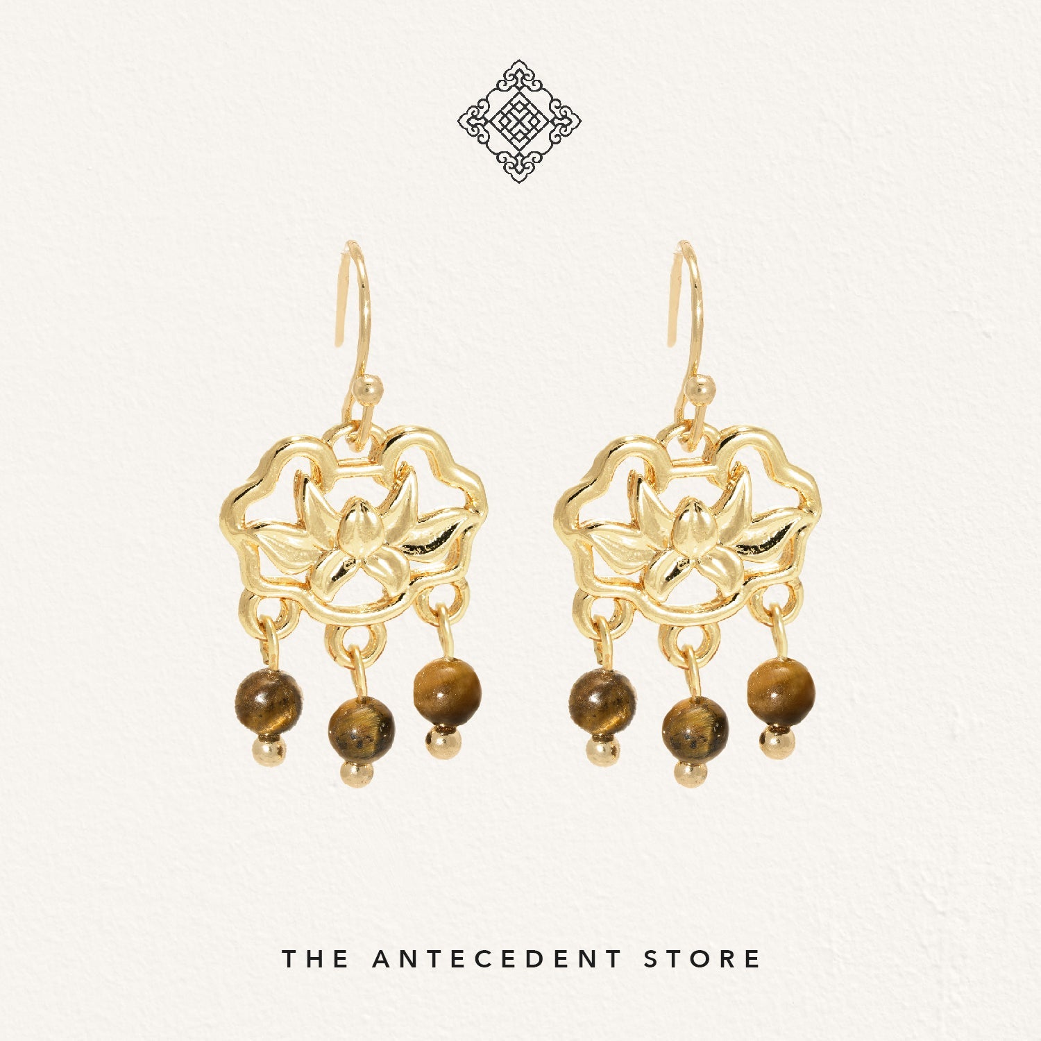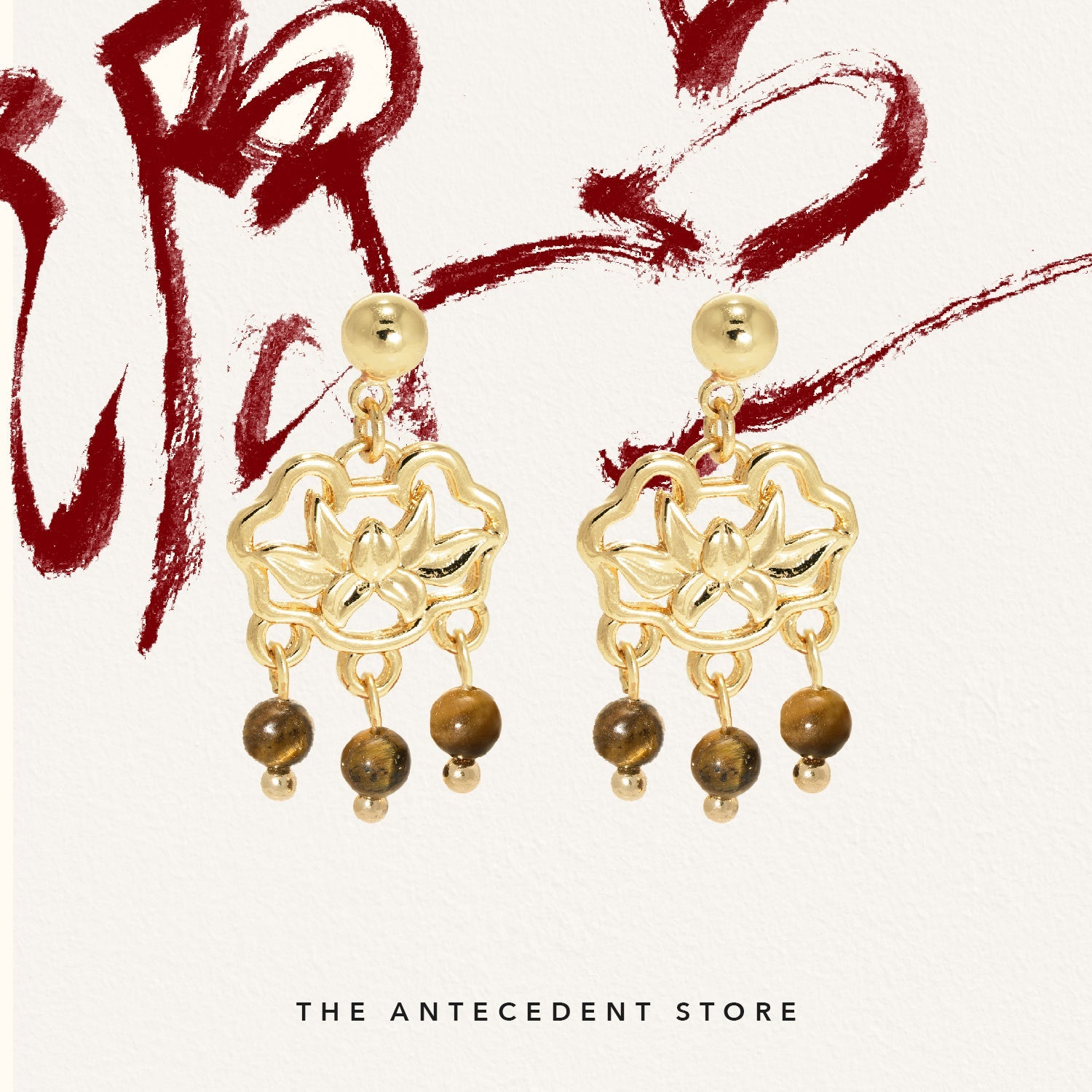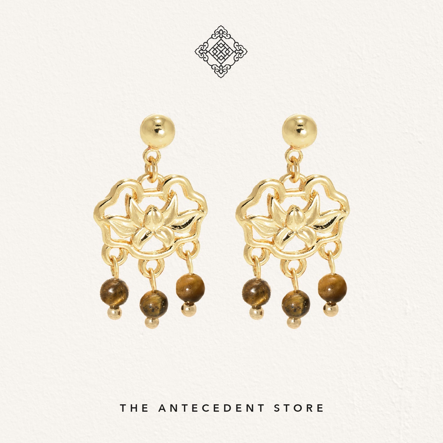 Celebrate enduring elegance with THE ANTECEDENT STORE 如意锁 Longevity Lock Earrings With Tiger Eye Crystal, featuring 14K real gold plating and a symbolic design inspired by traditional motifs of good fortune, longevity, and protection. The striking tiger eye crystal is paired with a lotus flower detail, representing purity and regeneration, making these earrings a meaningful addition to any jewellery collection.Versatile enough for both everyday wear and special occasions, these earrings complement both modern and traditional outfits. Pair them with your favourite dress or elevate a casual ensemble for a refined touch that enhances your existing accessories.