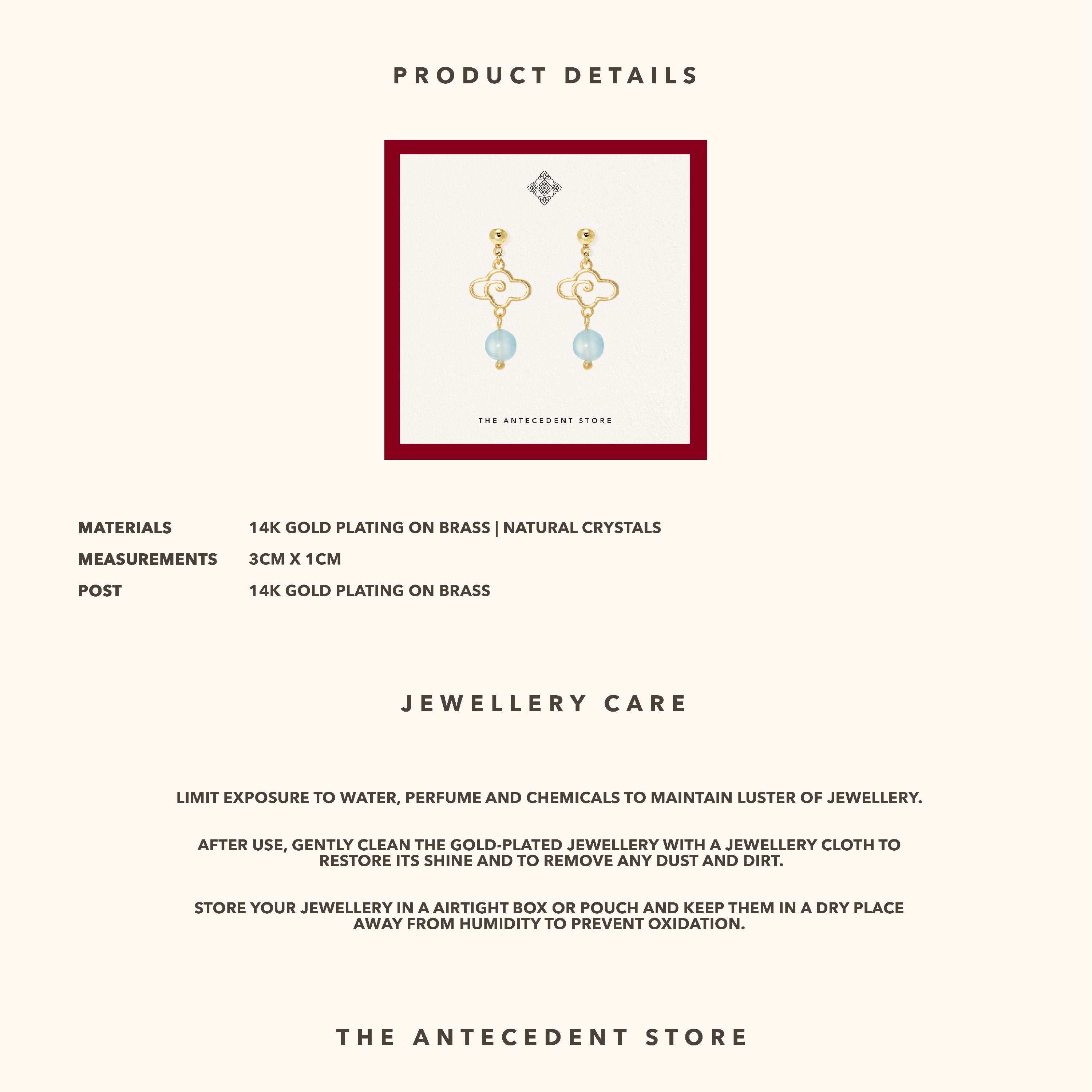 Elevate your jewellery collection with the 【 祥云 】Auspicious Cloud Earrings by THE ANTECEDENT STORE, featuring 14K real gold plating. Inspired by the symbolic "auspicious clouds," these earrings blend cultural heritage with refined elegance for a meaningful accessory.Perfect for both everyday wear and special occasions, these earrings add a touch of sophistication to casual outfits or complement formal attire. Their timeless design pairs effortlessly with other gold or pearl pieces you already own.