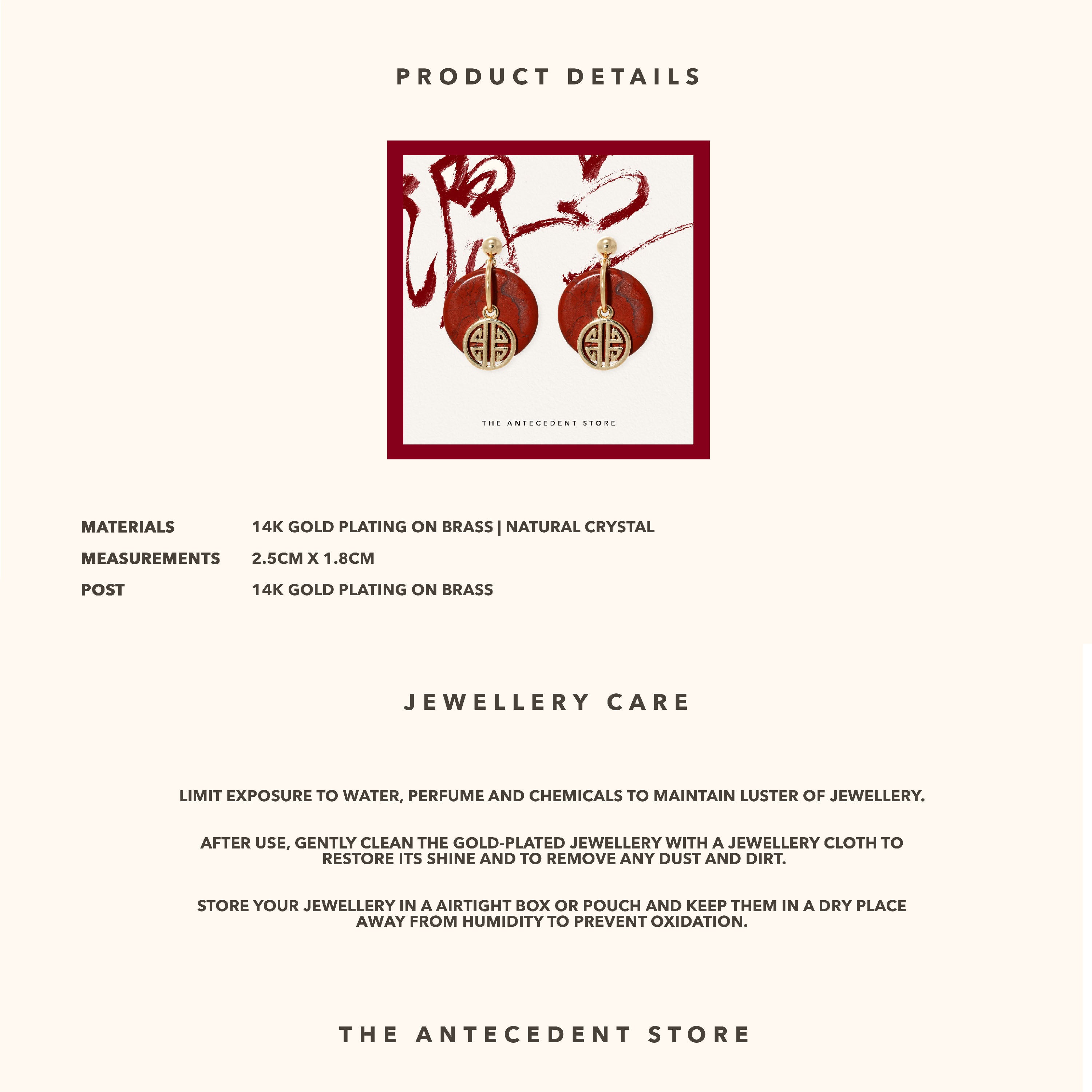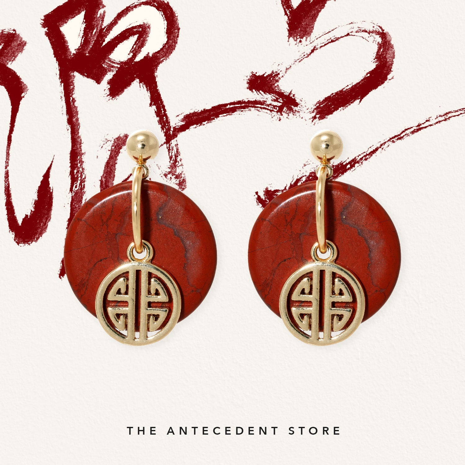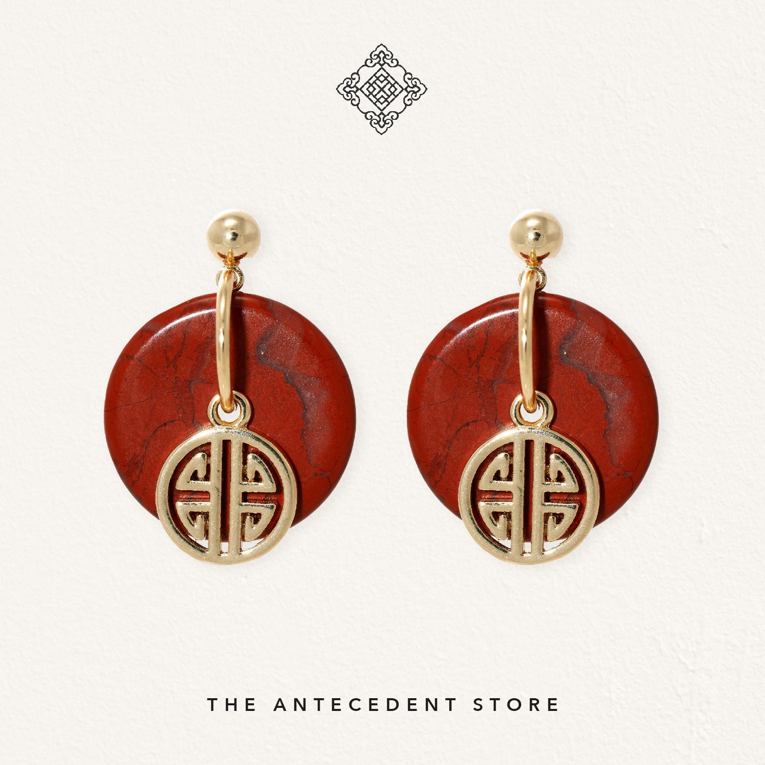 Celebrate prosperity and protection with THE ANTECEDENT STORE 【祿】Red Jasper Crystal Earrings, crafted in 14K real gold plating. The distinctive round 平安扣 (donut) shape symbolises good fortune and timeless elegance, making these earrings a meaningful addition to your collection.Versatile enough for both everyday wear and special occasions, these earrings pair beautifully with both modern and traditional outfits. Their classic design complements existing jewellery, adding a refined touch to any ensemble.