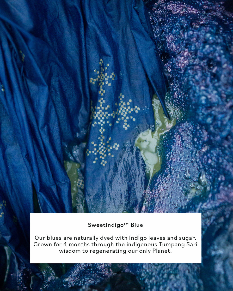 Plant-dyed. Dyed in natural Indigo six times over two weeks to achieve the lightness of blue sky. As a herbal medicine, Indigo is a natural antiseptic and has a cooling effect on the skin.