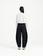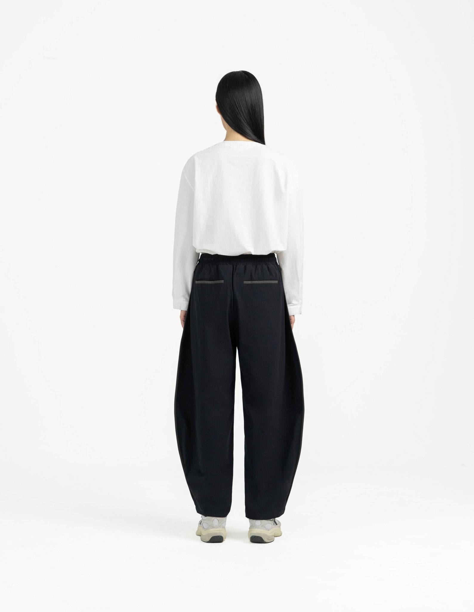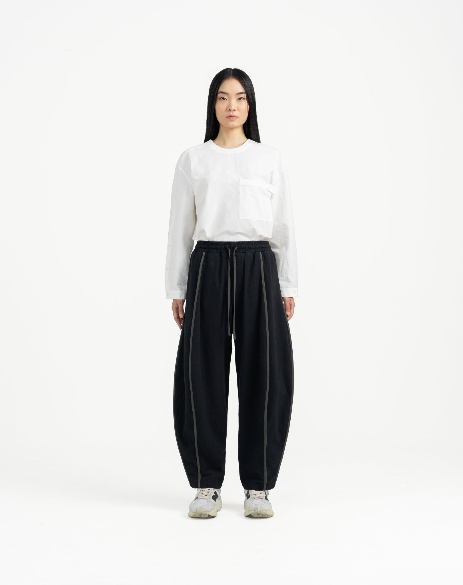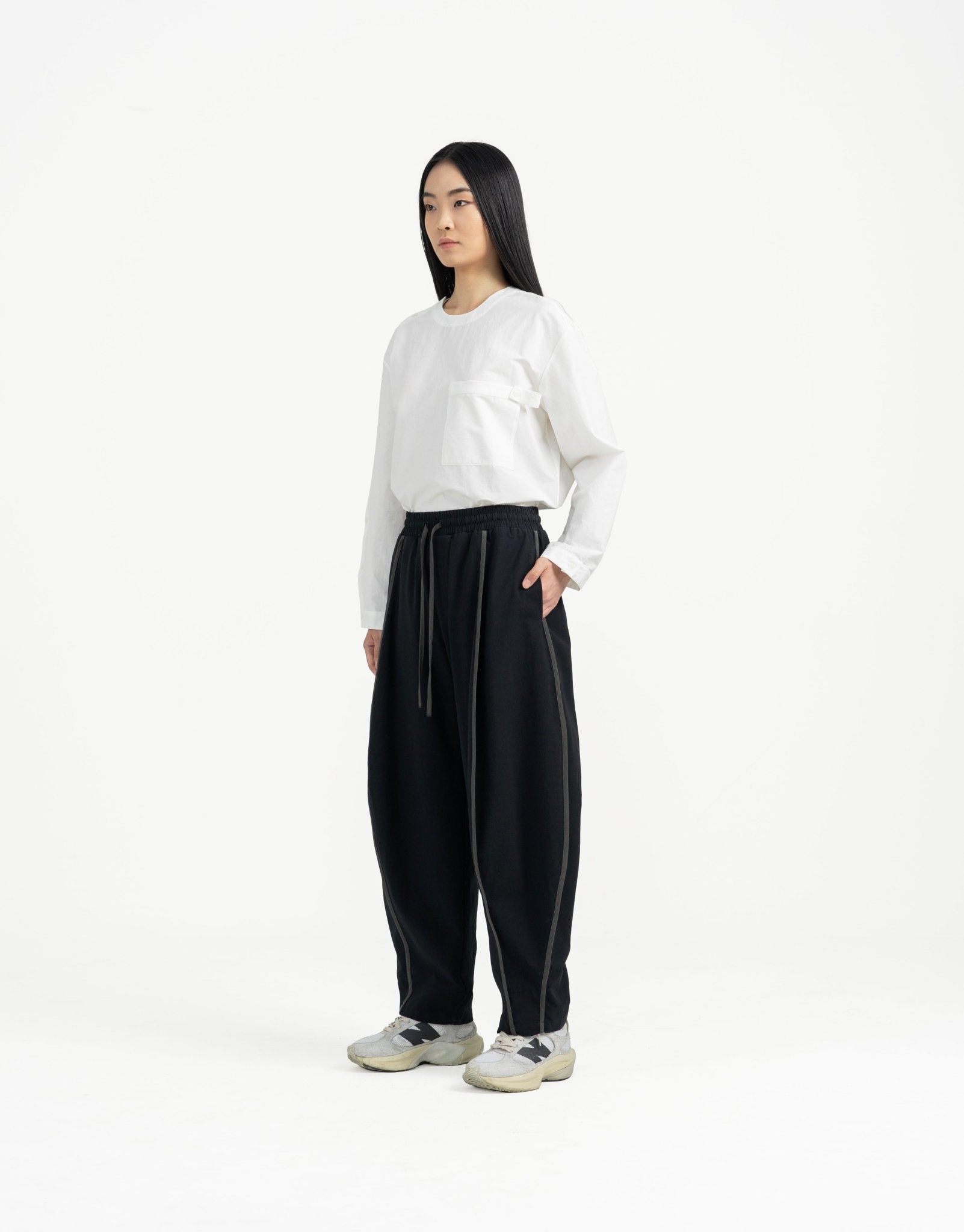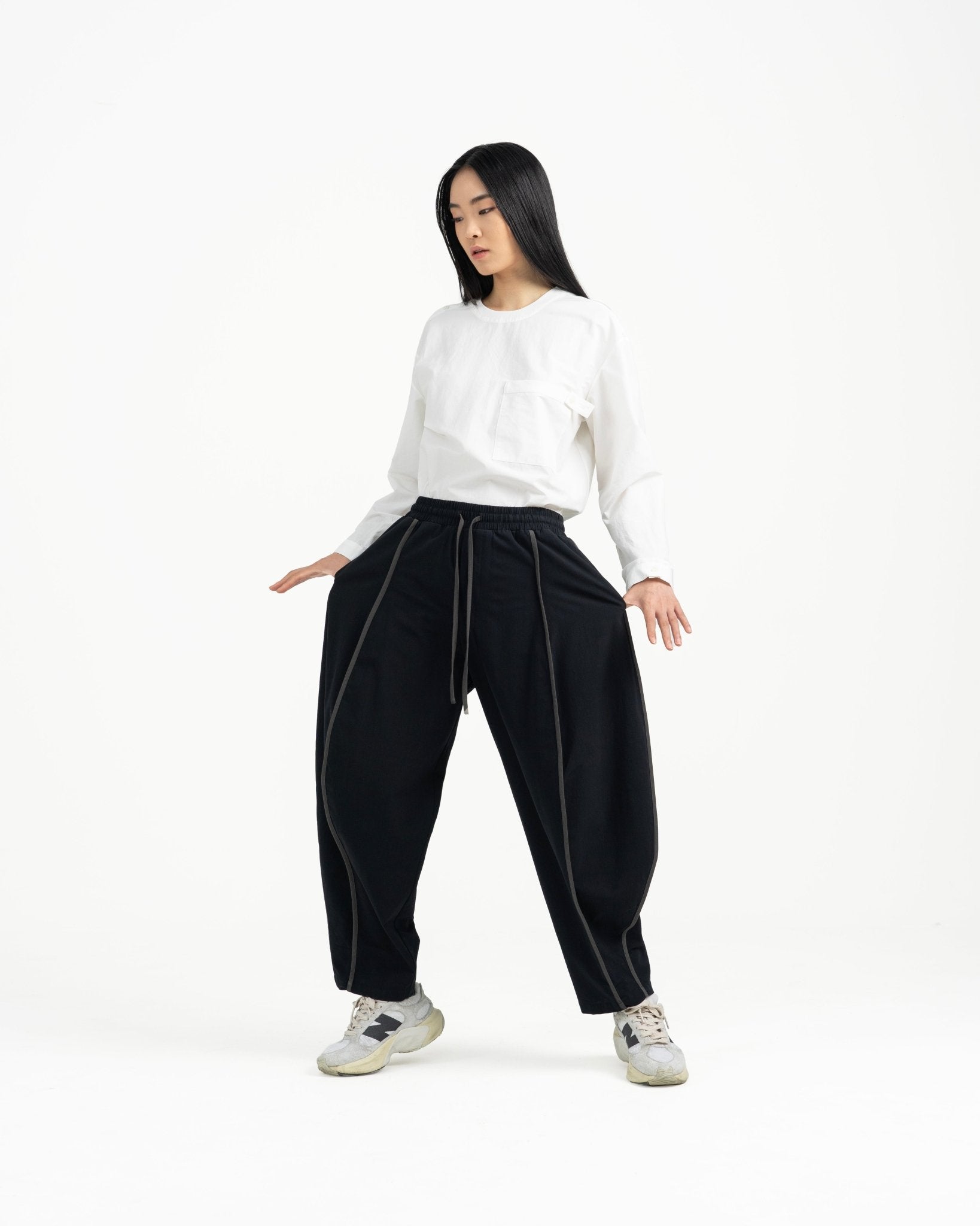 Elevate your everyday wardrobe with the GRAYE Balloon Binding Pants in Black, designed for those who appreciate both structure and comfort. The six-panel construction and artfully curved silhouette create a modern balloon shape, while contrast binding on the inside-out seams adds a distinctive visual edge.Versatile enough for both relaxed weekends and active days, these pants pair effortlessly with fitted tops or oversized shirts. Their understated design complements a range of existing wardrobe staples, making them a timeless addition to your collection.