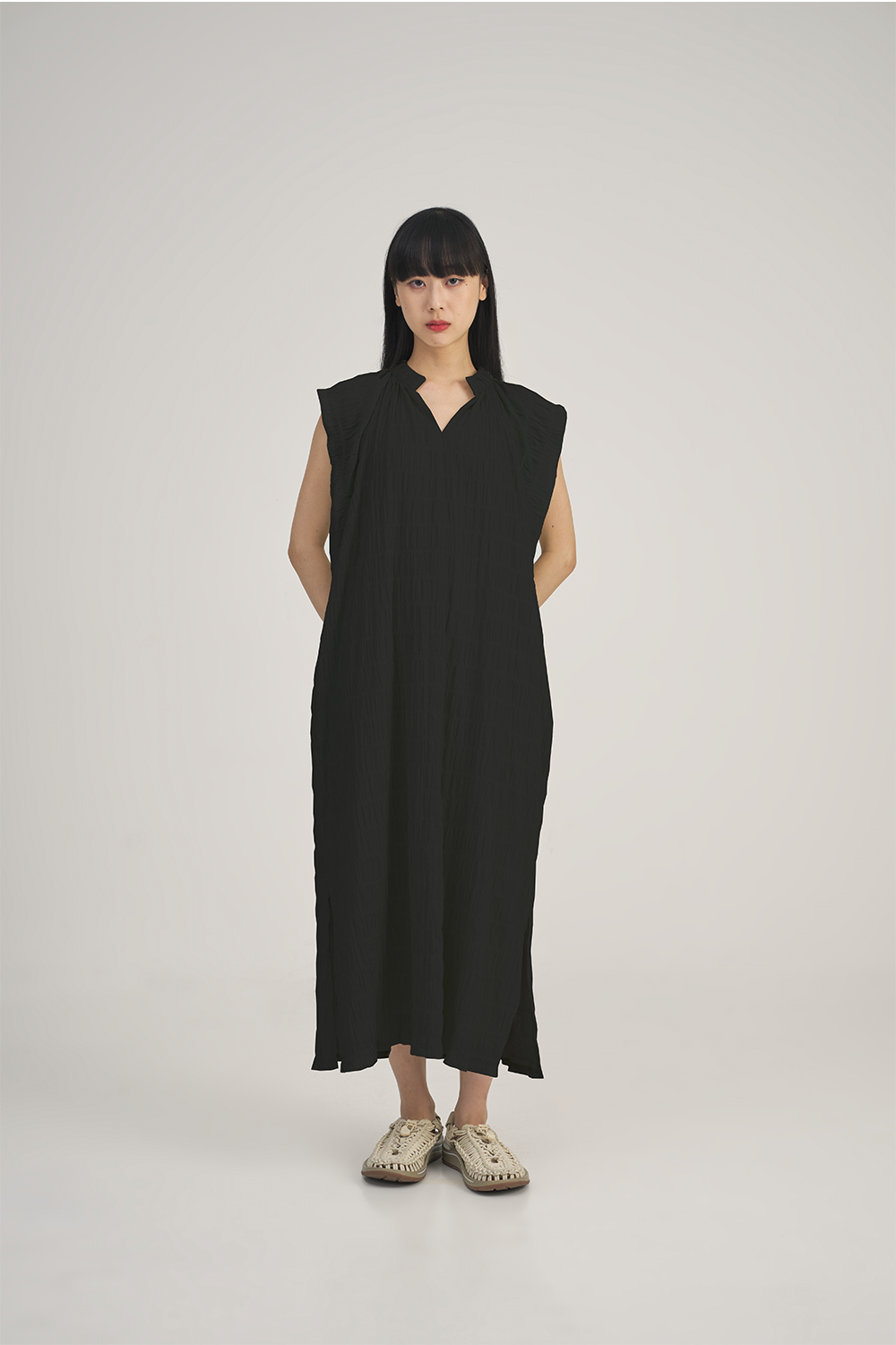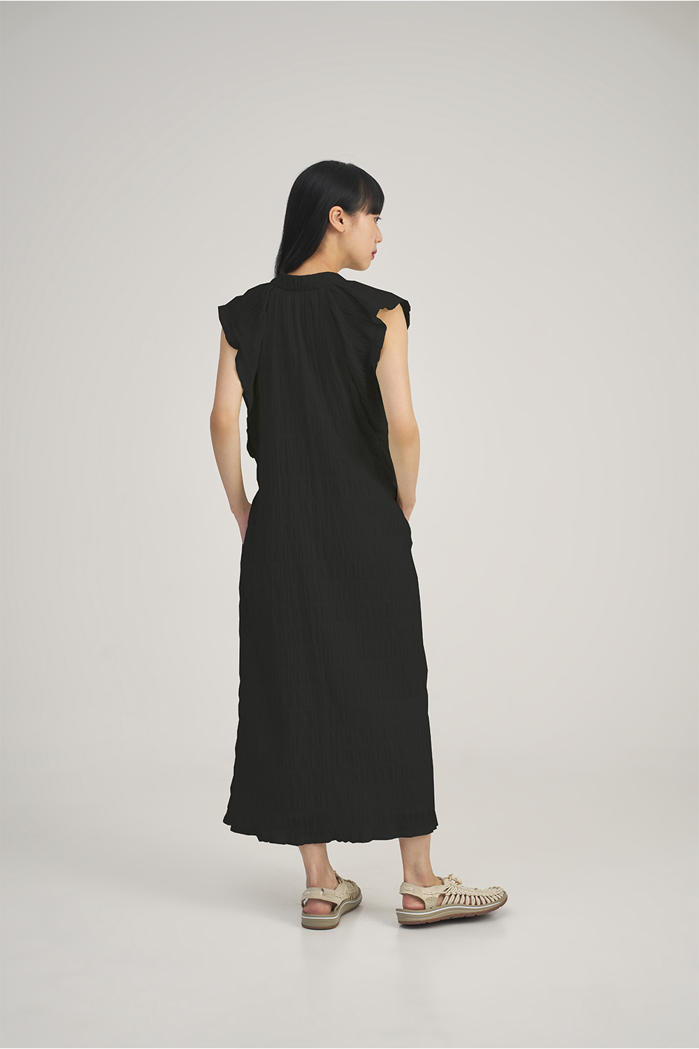 The SABRINAGOH Bianca Dress in Black is a refined statement piece, crafted from a breathable cotton-spandex blend with a distinctive ruched seersucker texture and subtle stripe detailing. Its flowing maxi silhouette, V-neckline, and softly gathered collar stand create an elegant yet relaxed look, while extended shoulder sleeves add a touch of structure.Versatile enough for both casual outings and elevated occasions, this dress pairs effortlessly with sandals for daytime ease or heels for evening sophistication. Its understated design complements a variety of accessories and layers seamlessly with your existing wardrobe.