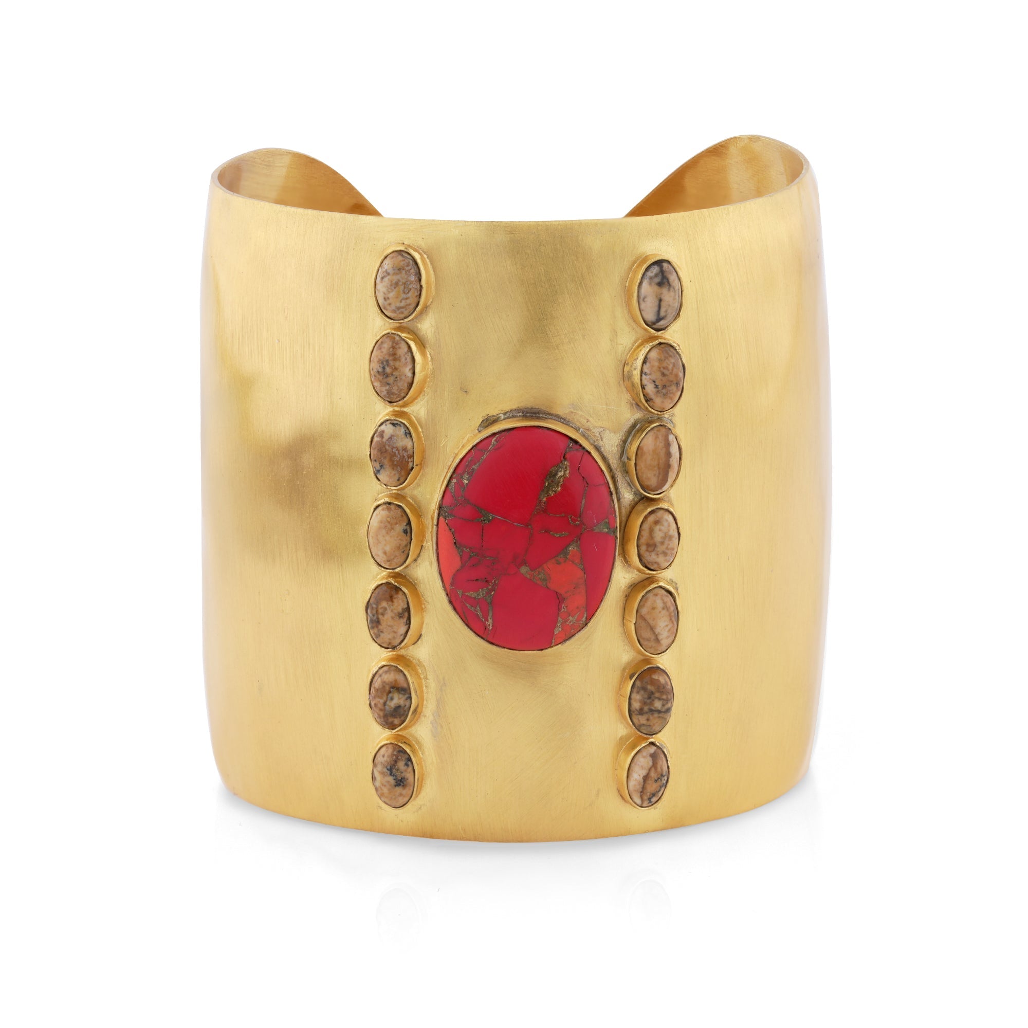 The Ngao Cuff by BOHEME BY VERO draws inspiration from the iconic shields of Maasai warriors, symbolising protection and courage. Crafted from 18kt gold-plated recycled brass, it features an array of semi-precious gemstones for a striking, meaningful accent.This statement cuff transitions effortlessly from day to evening, adding a bold touch to both casual and formal ensembles. Its adjustable width ensures it layers beautifully with other jewellery or stands out on its own, complementing any collection.