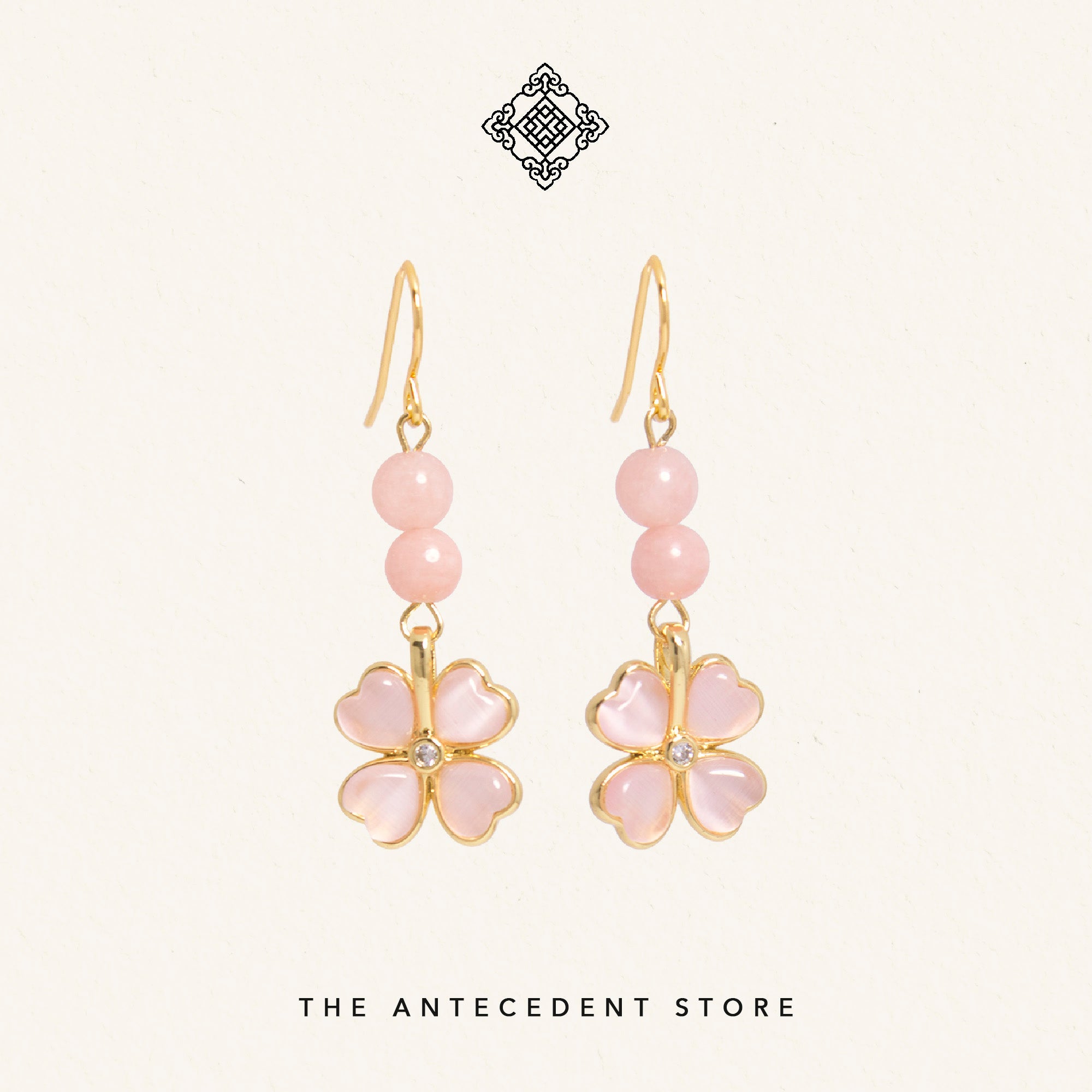 THE ANTECEDENT STORE’s Clover Cat Eye Stone Earrings blend symbolic elegance with refined craftsmanship, featuring four-leaf clover motifs paired with pink cat eye stone and pink opal gemstones. The gentle hues and natural stones create a delicate, uplifting accent for any jewellery collection.These earrings transition effortlessly from day to evening, adding a touch of charm to both casual and formal ensembles. Their versatile design complements a range of styles, making them a thoughtful addition to your existing accessories.