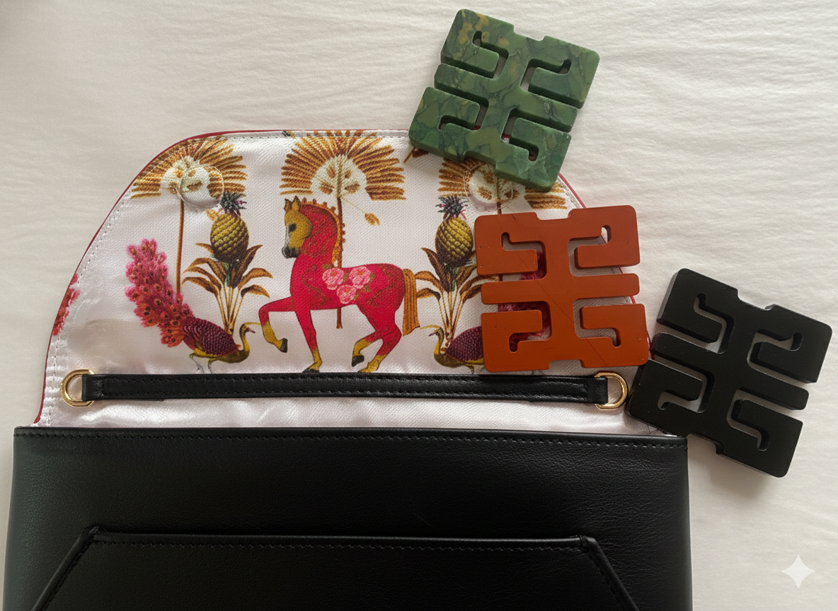 DESTI SAINT’s Oliver's Eden Imperial Grace Black Envelope is a refined statement piece, distinguished by its African Jade "Double Happiness" stone set against buttery-soft leather. This elegant clutch blends enduring symbolism with contemporary sophistication, offering a tactile and visual delight.Perfect for formal occasions or elevating everyday ensembles, this envelope clutch transitions seamlessly from day to night. Its classic black hue and intricate interior design complement both modern and traditional wardrobes.