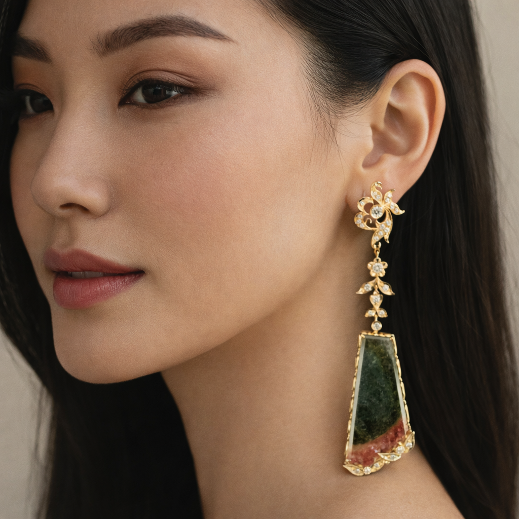 750 Y/G Peranakan Natural Diamond, Bi Tourmaline Earring – Heritage Craftsmanship Shines with Modern Luxury