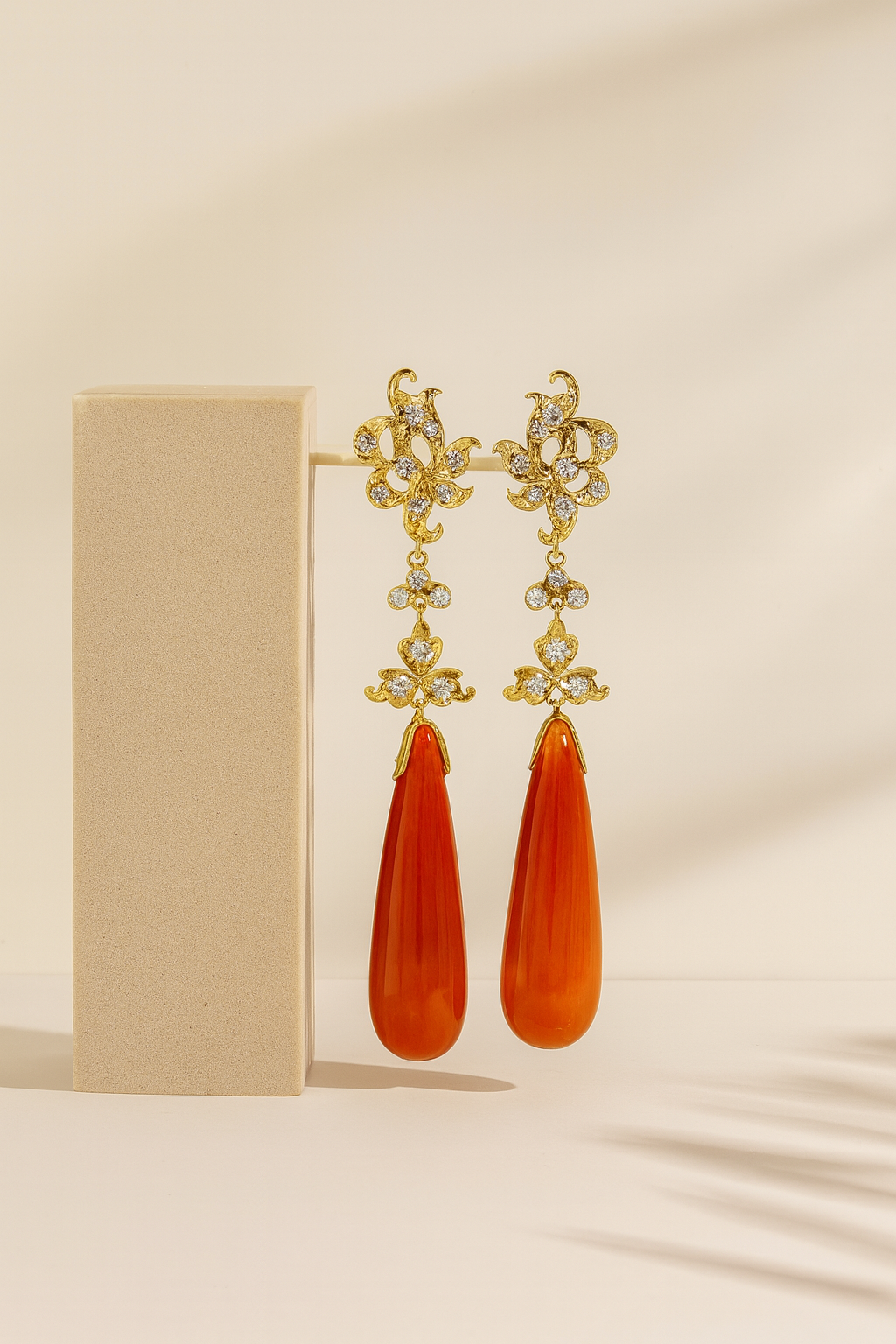 FOUNDATION JEWELLERS | 750 Y/G Peranakan Natural Diamond & Brown Jade Earring "Flower" 5.87gm Br.Jade 2-12.64gm D28-0.74ct