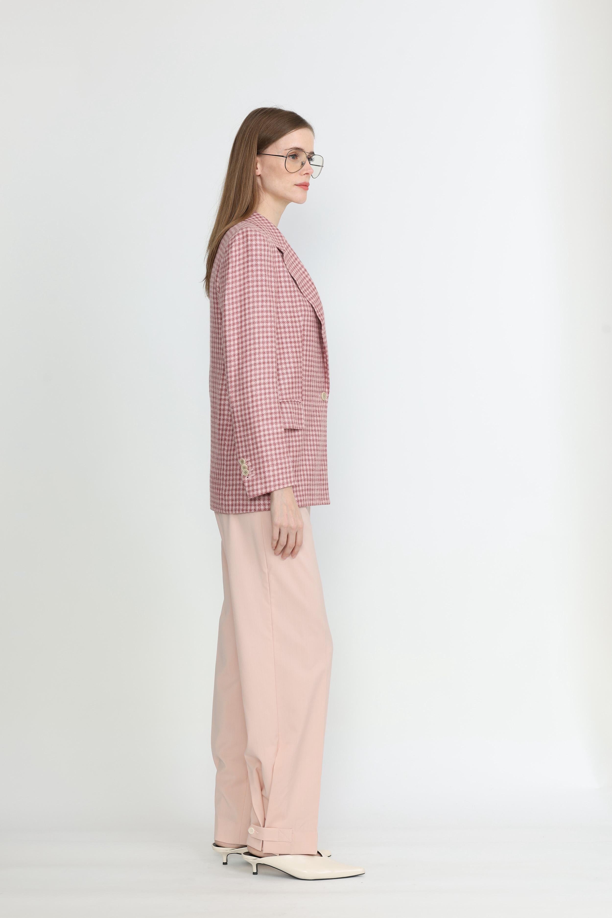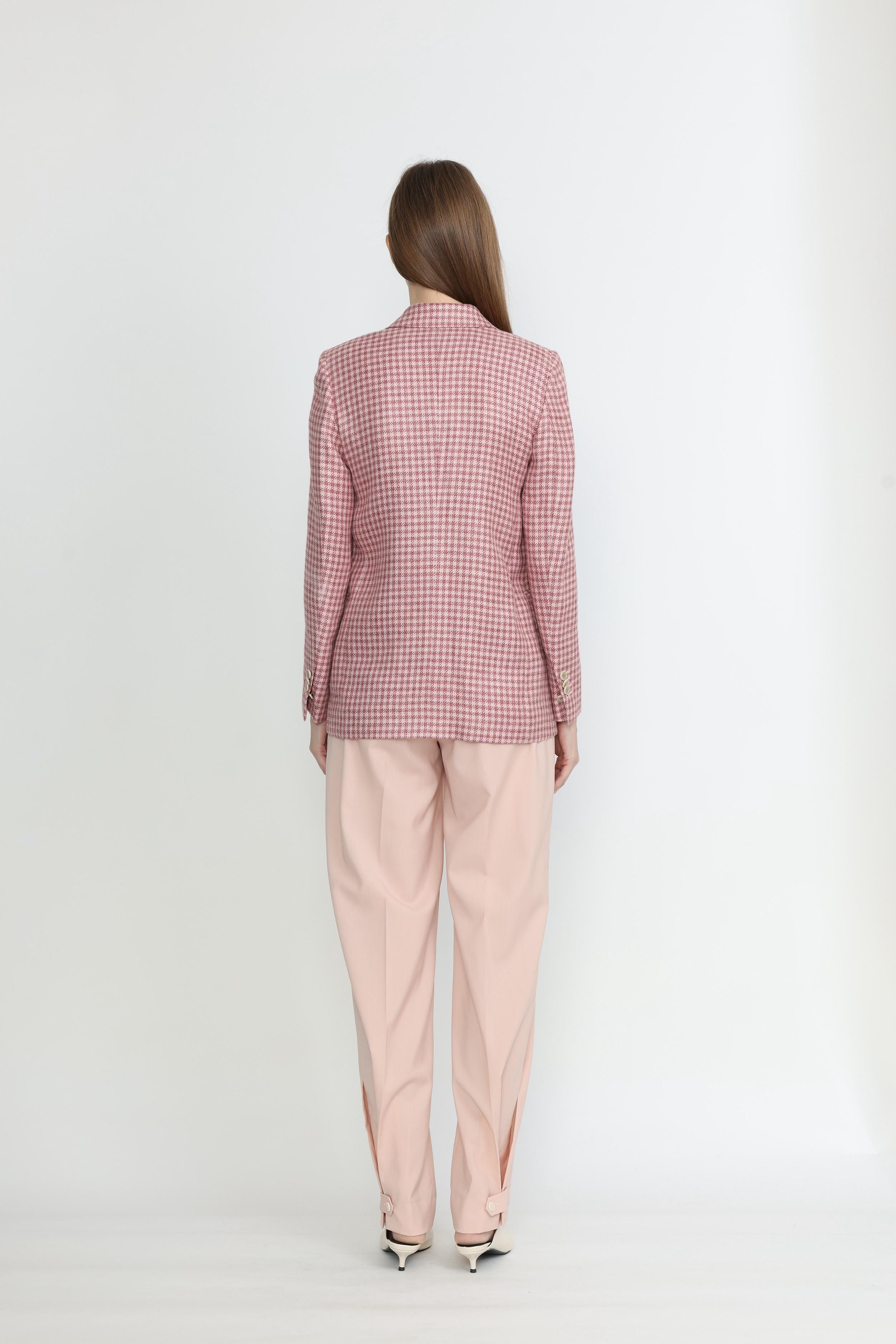 The Gold Coast Jacket by FREY offers a refined take on the classic boyfriend cut, presented in a distinctive pink dogtooth pattern. Its single-breasted silhouette, topstitched notched lapel, and fully functional surgeon's cuffs create a polished yet contemporary look.This versatile jacket transitions seamlessly from work to weekend, pairing effortlessly with tailored trousers for a sharp ensemble or layered over casual separates for a relaxed statement. Its timeless design complements both modern and classic wardrobes.