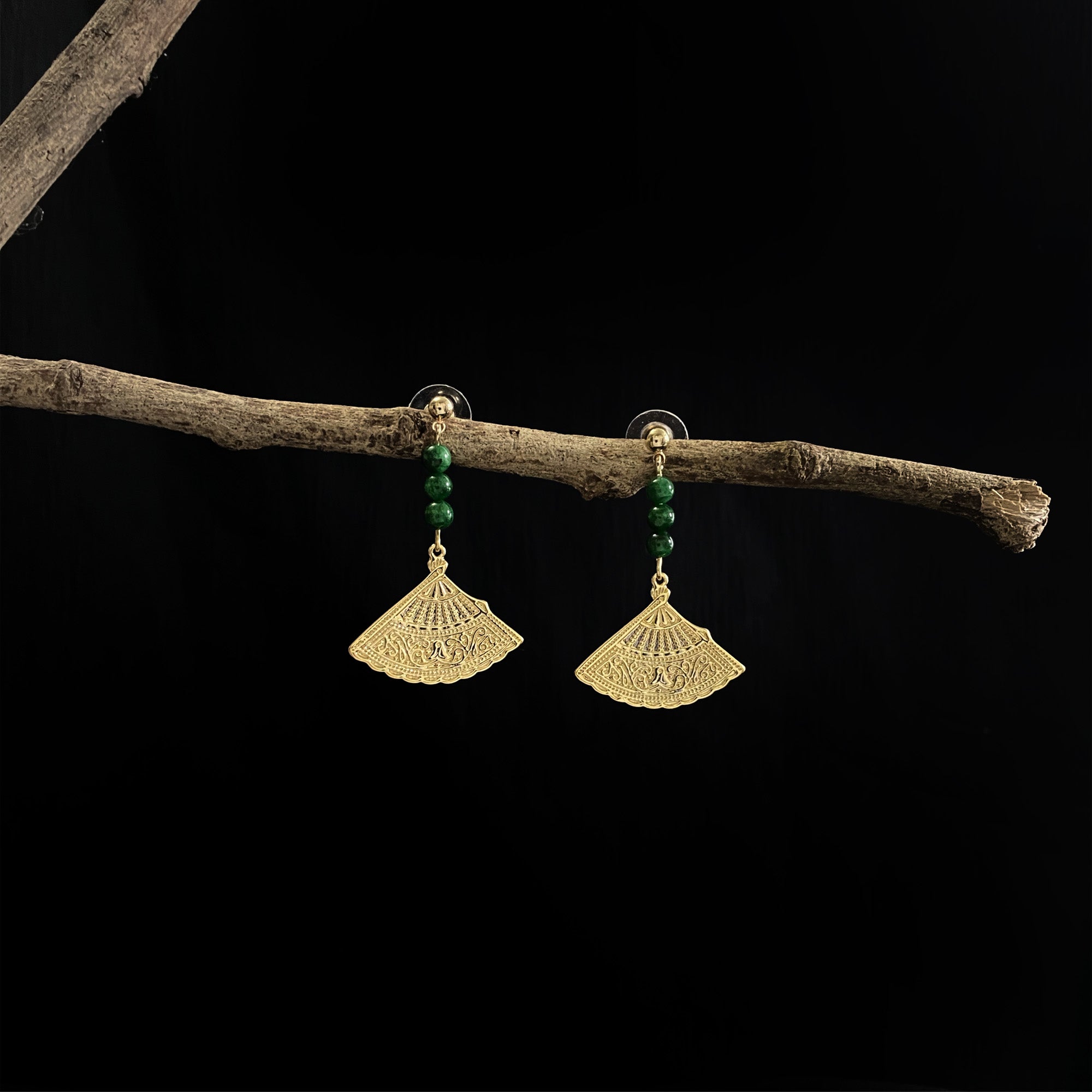 Make a striking impression with the Oriental Fan Motif Earrings With Chalcedony Crystal by THE ANTECEDENT STORE, featuring an intricately engraved fan-shaped design. The combination of green and red chalcedony crystals set in hypoallergenic 14K gold-plated metal offers a refined touch and unique visual appeal.These statement earrings effortlessly elevate both day and evening ensembles, pairing beautifully with minimalist outfits or complementing more ornate looks. Their versatile design makes them a standout addition to any jewellery collection.