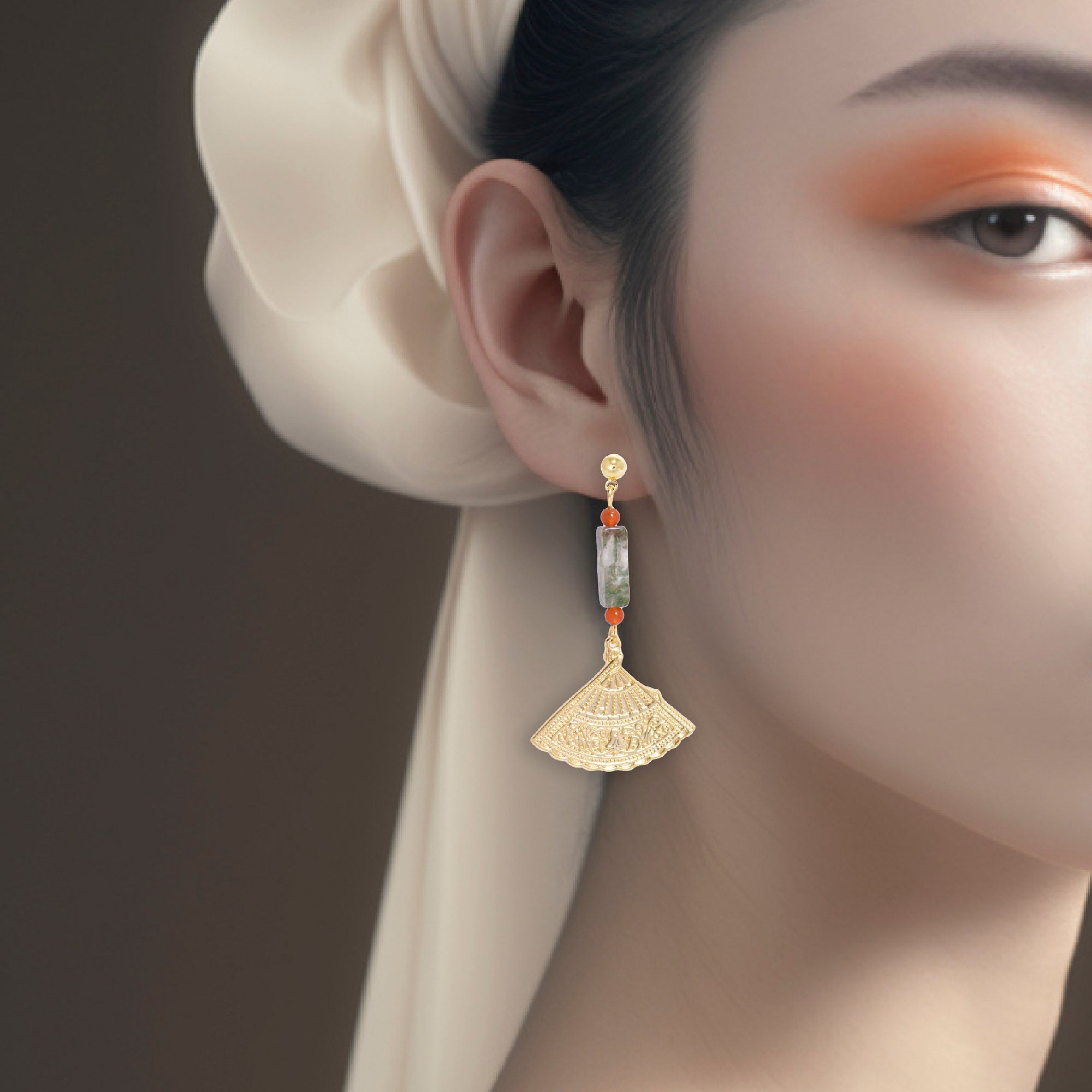 Oriental Fan Motif Earrings With Chalcedony Crystal – Timeless Artistry Meets Modern Glamour