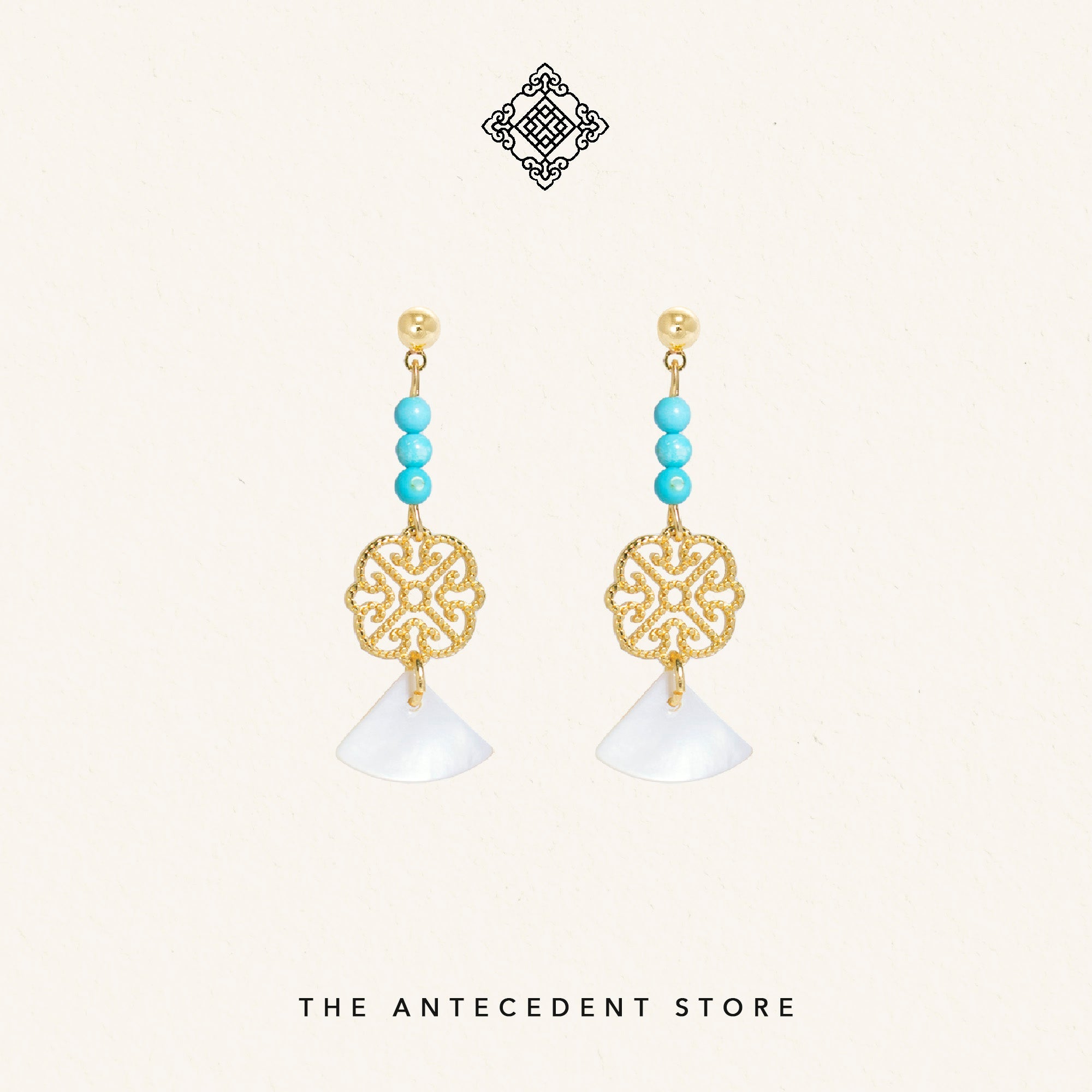 Elevate your look with the Oriental Motif Earrings With Rose Quartz from THE ANTECEDENT STORE, featuring delicate rose quartz stones and hypoallergenic 14K gold plated studs. Each pair is uniquely accented with turquoise crystal and natural shell, offering a refined blend of colour and texture.These earrings transition effortlessly from day to evening, adding a touch of elegance to both casual and formal ensembles. Their versatile design complements a wide range of jewellery and wardrobe staples, making them a timeless addition to your collection.