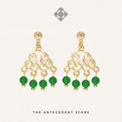 Elevate your jewellery collection with the Oriental Motif Earrings from THE ANTECEDENT STORE, featuring luminous green chalcedony crystals and finished in 14K real gold plating. These earrings blend timeless elegance with a distinctive, modern twist.Perfect for both everyday wear and special occasions, these earrings add a refined pop of colour to any ensemble. Their versatile design complements both contemporary and traditional styles, making them a seamless addition to your existing accessories.