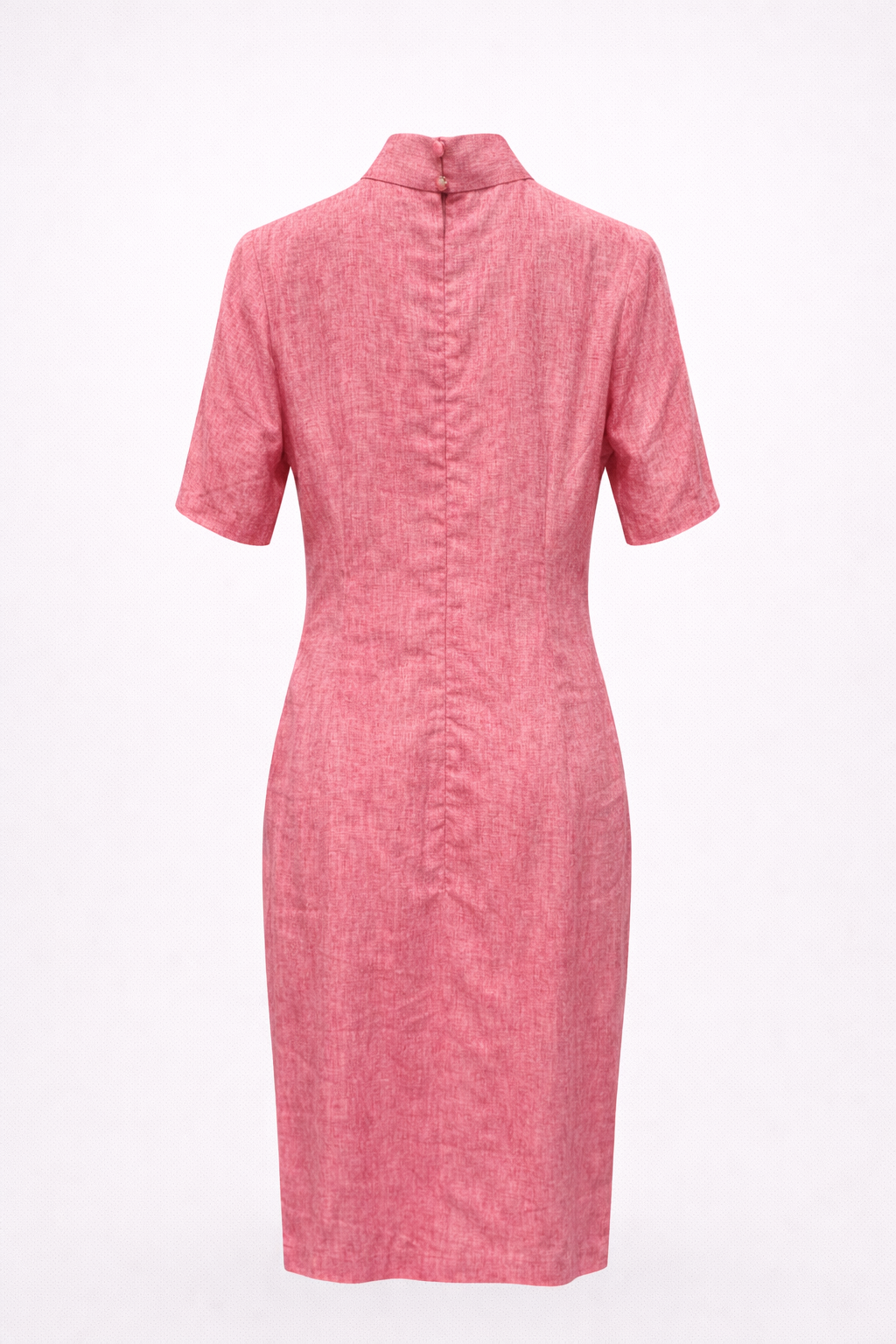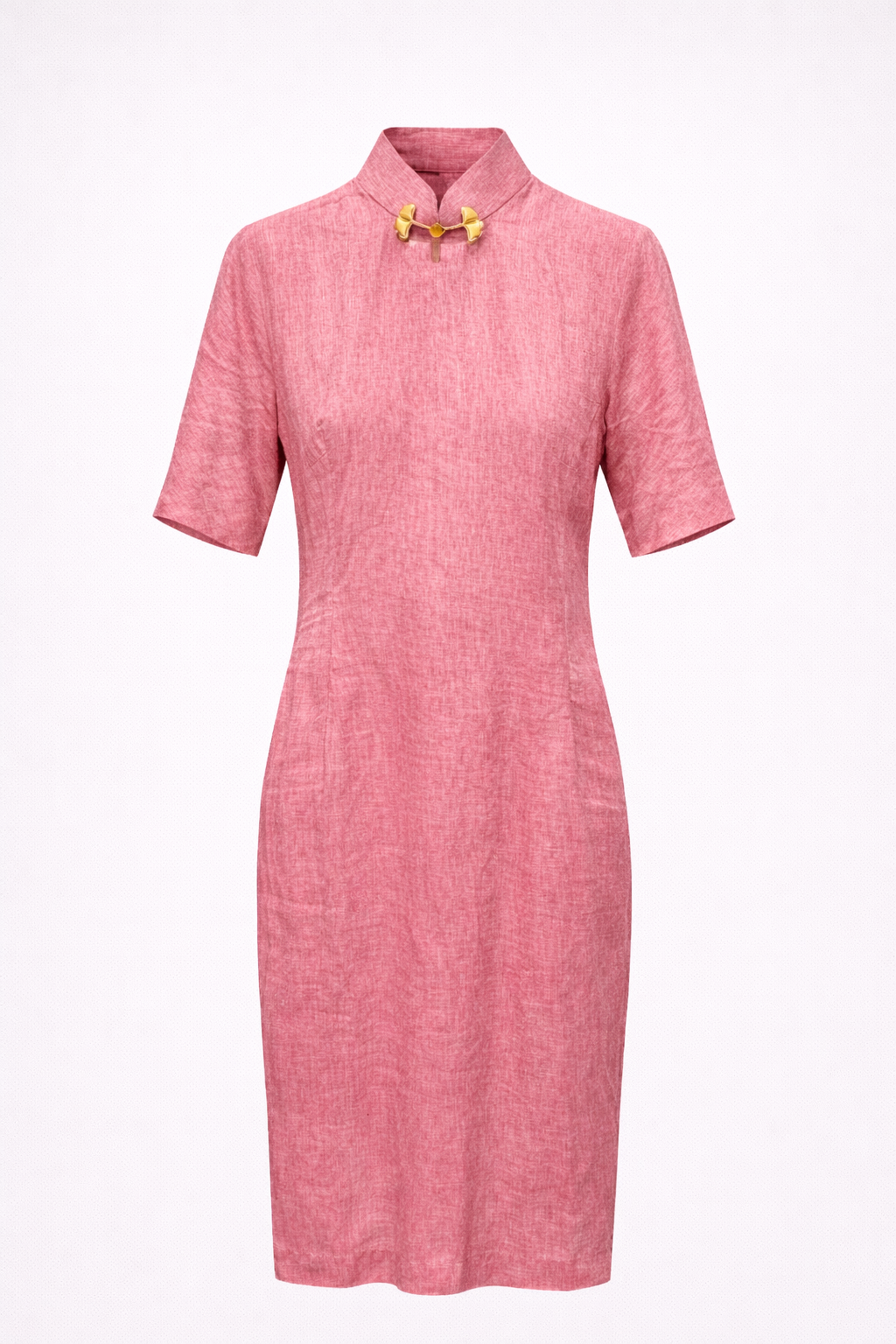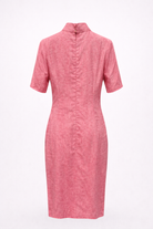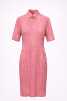 A graceful pink cheongsam dress that blends heritage elements with modern sophistication.
