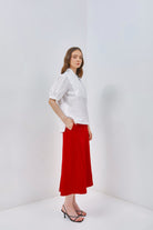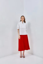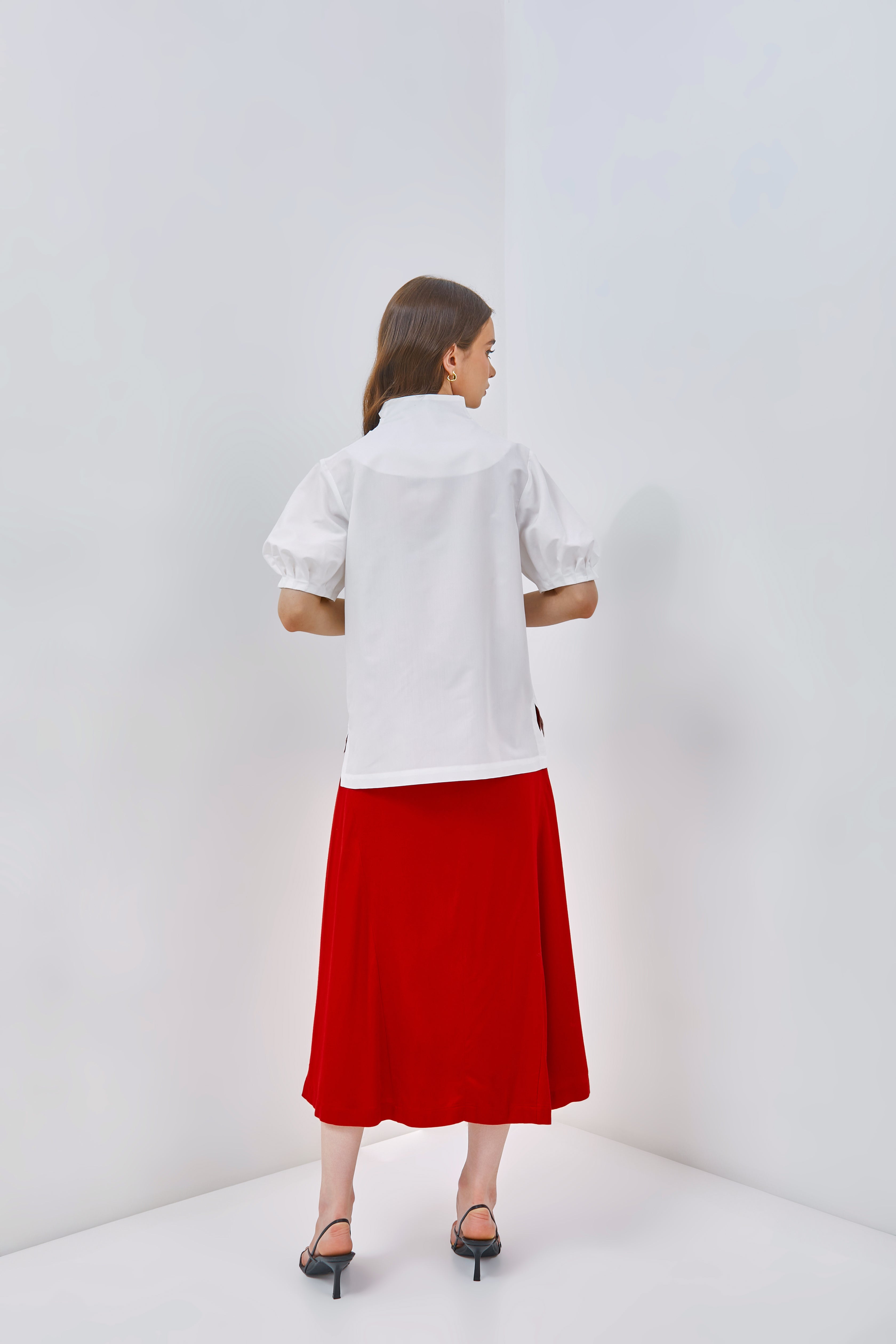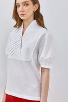 Elevate your wardrobe with the Pleated Top With High Collar from CAELI ECO LUXE, designed in crisp white recycled polyester for a refined silhouette. The high collar and artful pleats create a look of understated elegance while offering a flattering drape and smooth comfort.This versatile piece transitions seamlessly from work to weekend. Pair it with a pencil skirt for a polished office ensemble, or style with tailored shorts and loafers for effortless sophistication on casual days. Its classic design complements both modern and timeless wardrobes.
