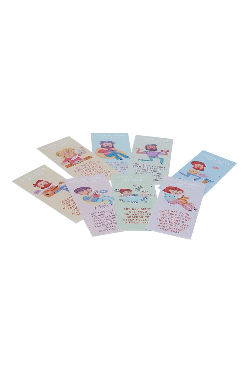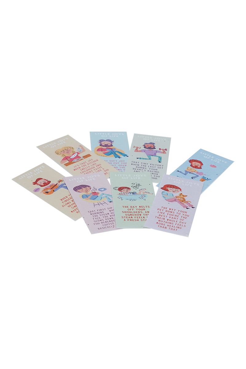 Celebrate the simple pleasures of reading and sustainability with the Plantable Bookmarks - Little Joys of Life by PURPLE & PURE. Each bookmark is crafted from biodegradable seed paper embedded with basil seeds, offering a unique blend of artistry and eco-conscious design. Mark your pages and, when finished, plant the bookmark to grow fresh basil—transforming everyday moments into lasting greenery.This set of eight bookmarks features uplifting, artistic visuals inspired by life's small joys, making them perfect for personal reading, thoughtful gifts, or even corporate giveaways. They complement any book collection and add a mindful, sustainable touch to your reading routine.