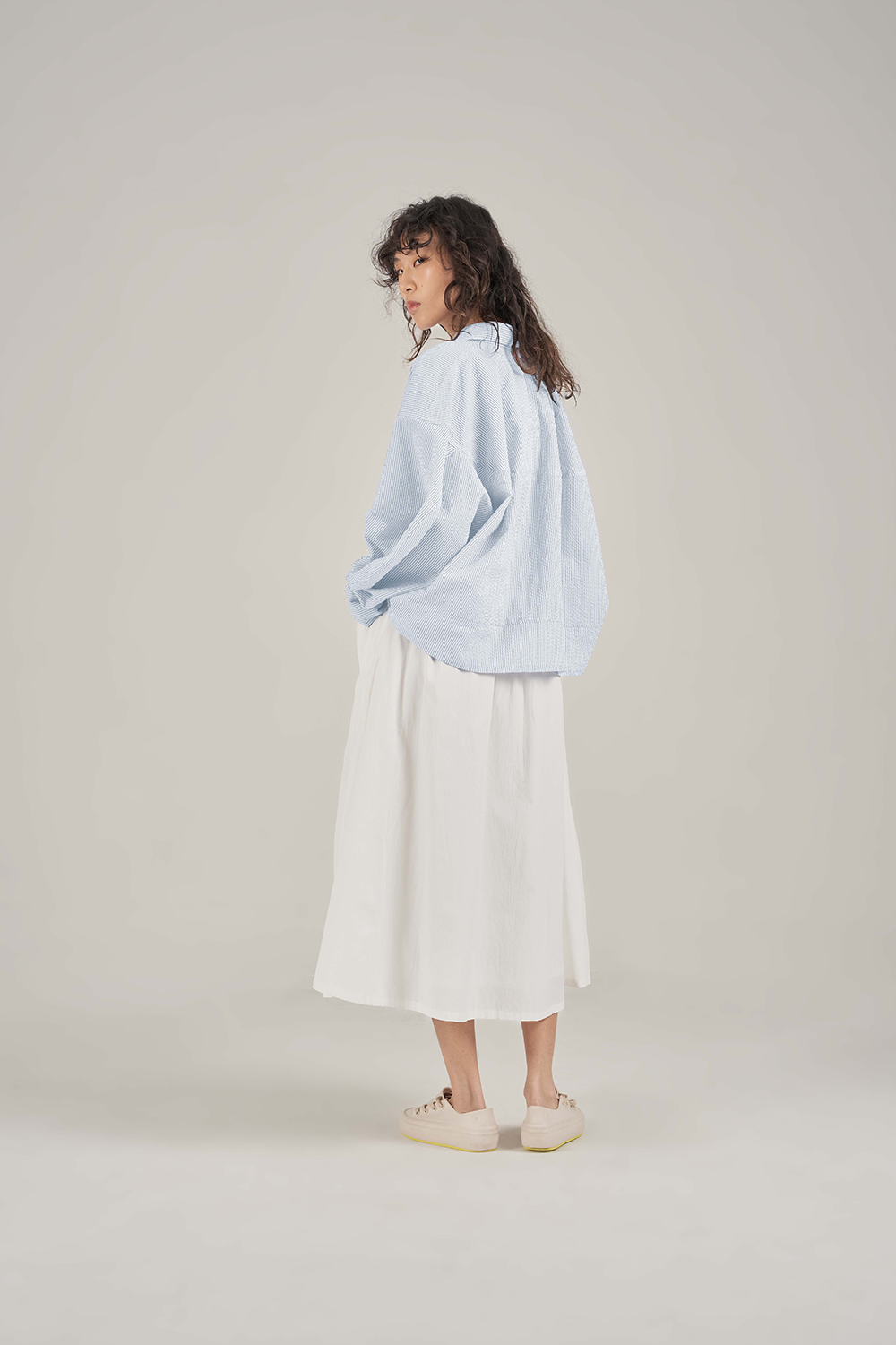 The Orion Shirt by SABRINAGOH redefines everyday style with its 100% seersucker striped cotton construction, offering a unique blend of structure and comfort. Its oversized round silhouette and voluminous sleeves create a modern, flattering drape, while a back horizontal seamline adds a subtle, sophisticated detail.Versatile enough for both work and leisure, this shirt pairs effortlessly with tailored trousers or casual denim. Its timeless design complements existing wardrobe staples, making it a go-to piece for any season.