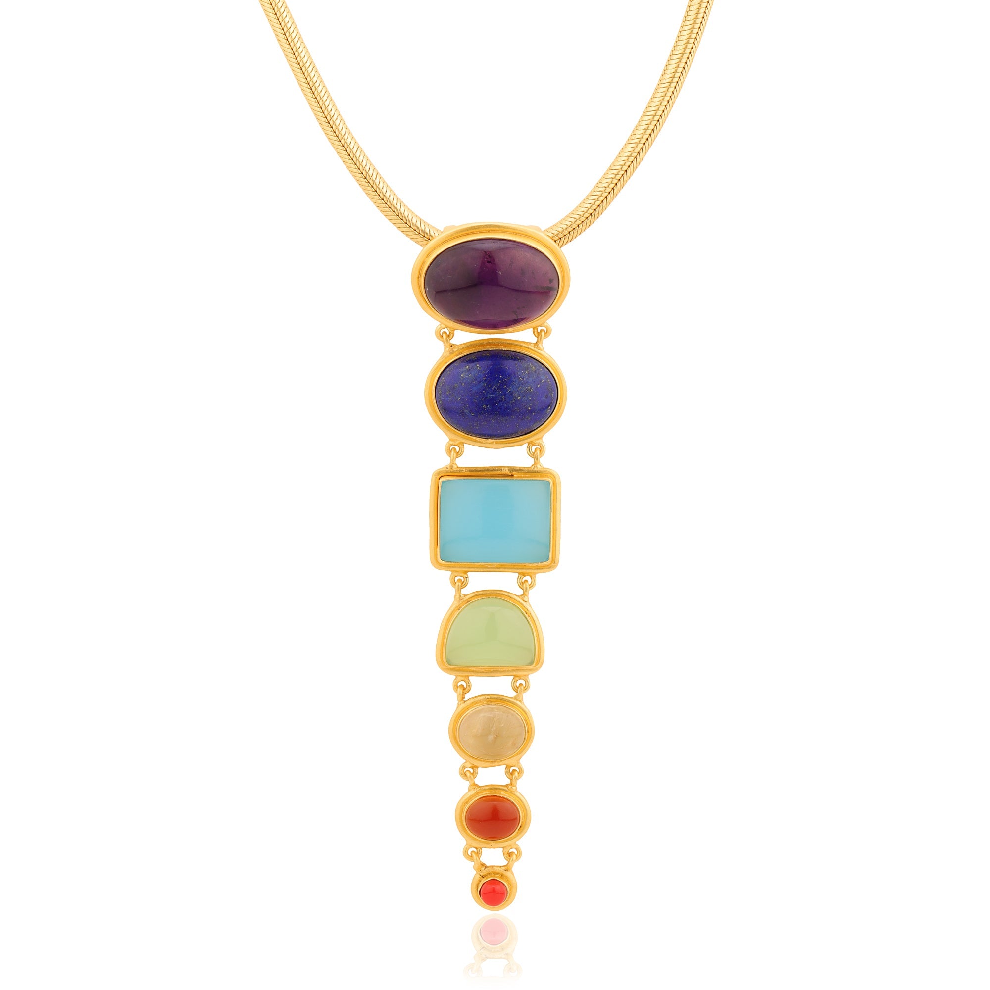 The necklace features the vibrant colors of the chakras, adding an element of spiritual balance and harmony to their elegant design.