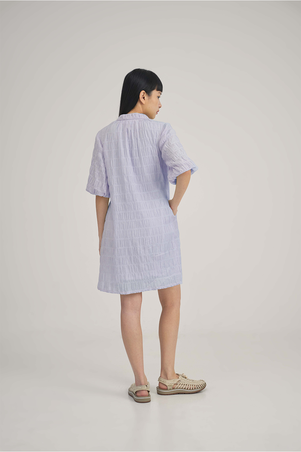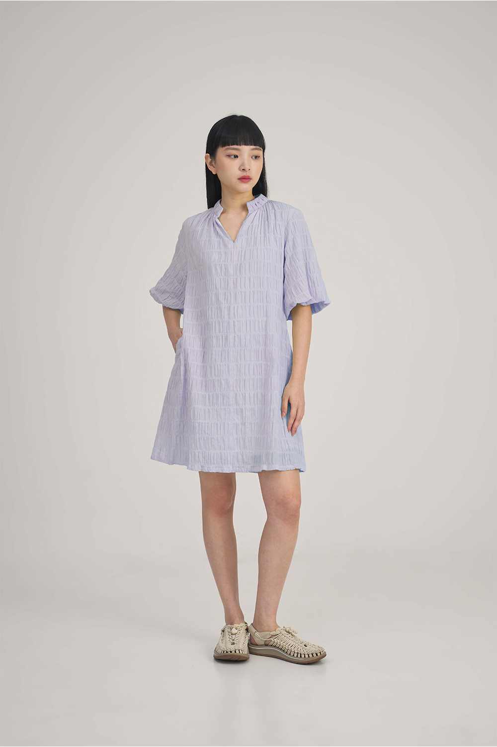 The SABRINAGOH Aurelia Dress in Purple is a refined choice for those who value understated elegance, featuring a ruched seersucker texture and fine stripe detailing. Its cotton-spandex blend offers gentle structure and all-day comfort, while the V-neckline and soft puff sleeves lend a modern, feminine touch.Versatile enough for both work and weekend occasions, this knee-length dress pairs effortlessly with sandals for a relaxed look or heels for a polished ensemble. Side pockets add practical appeal, making it a seamless addition to your existing wardrobe staples.