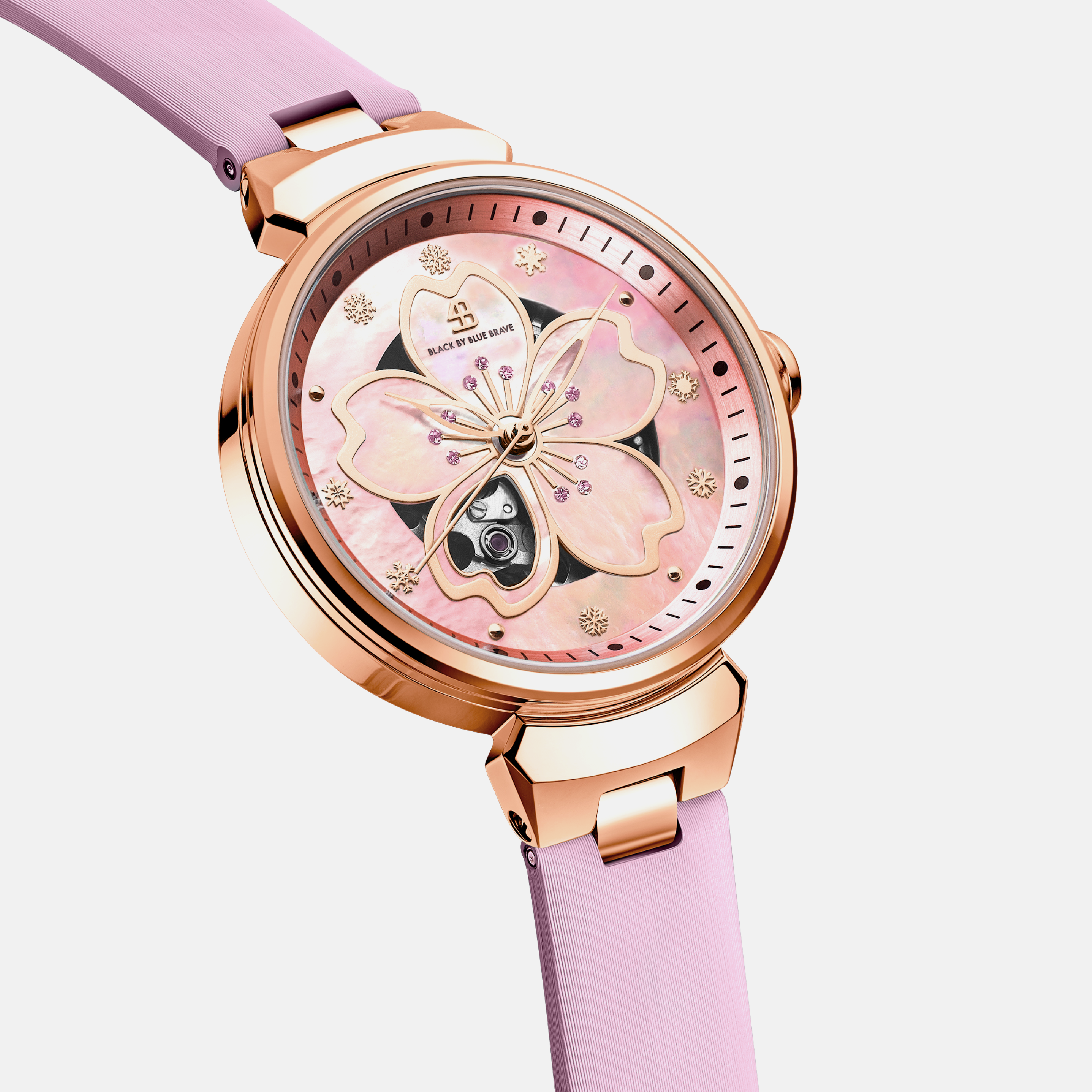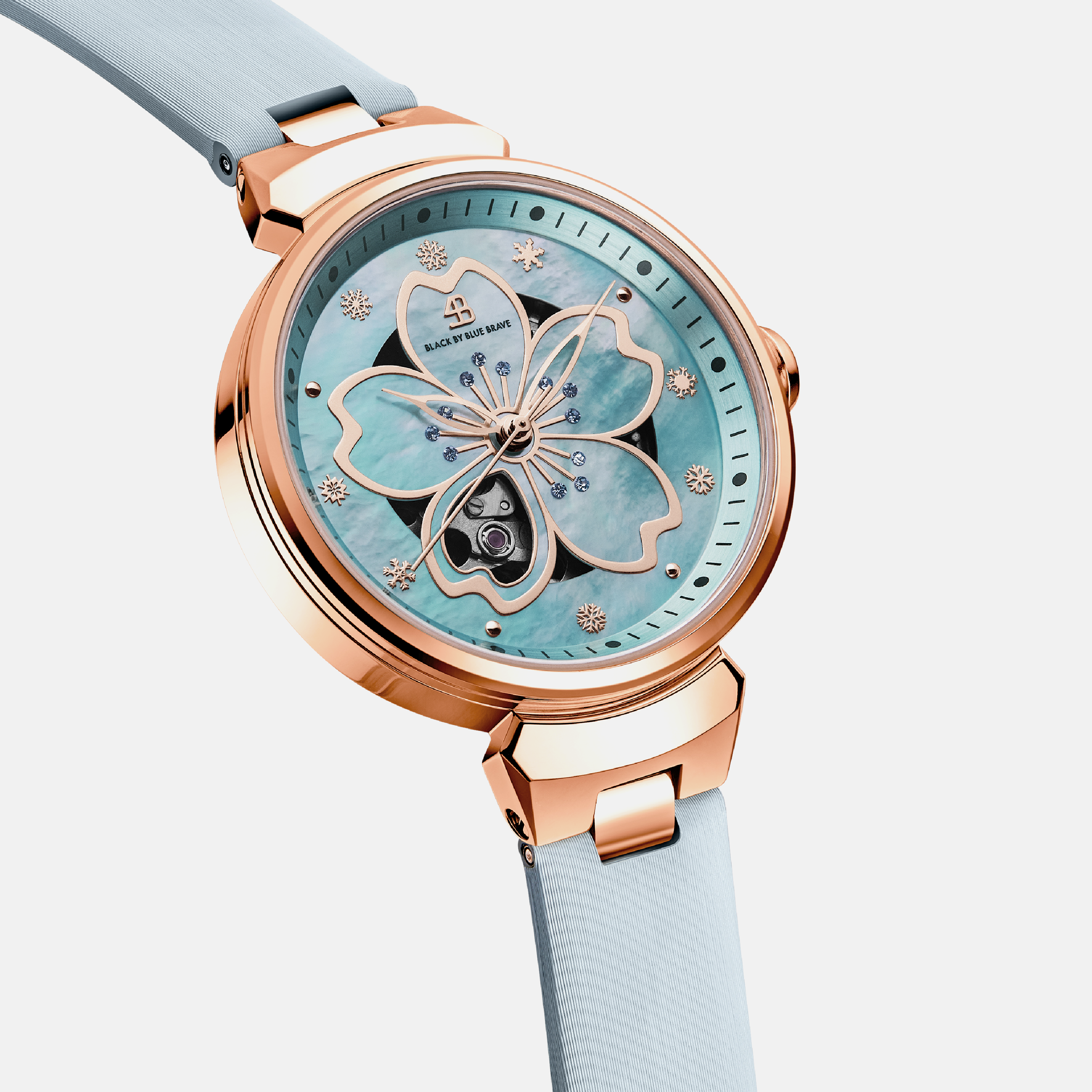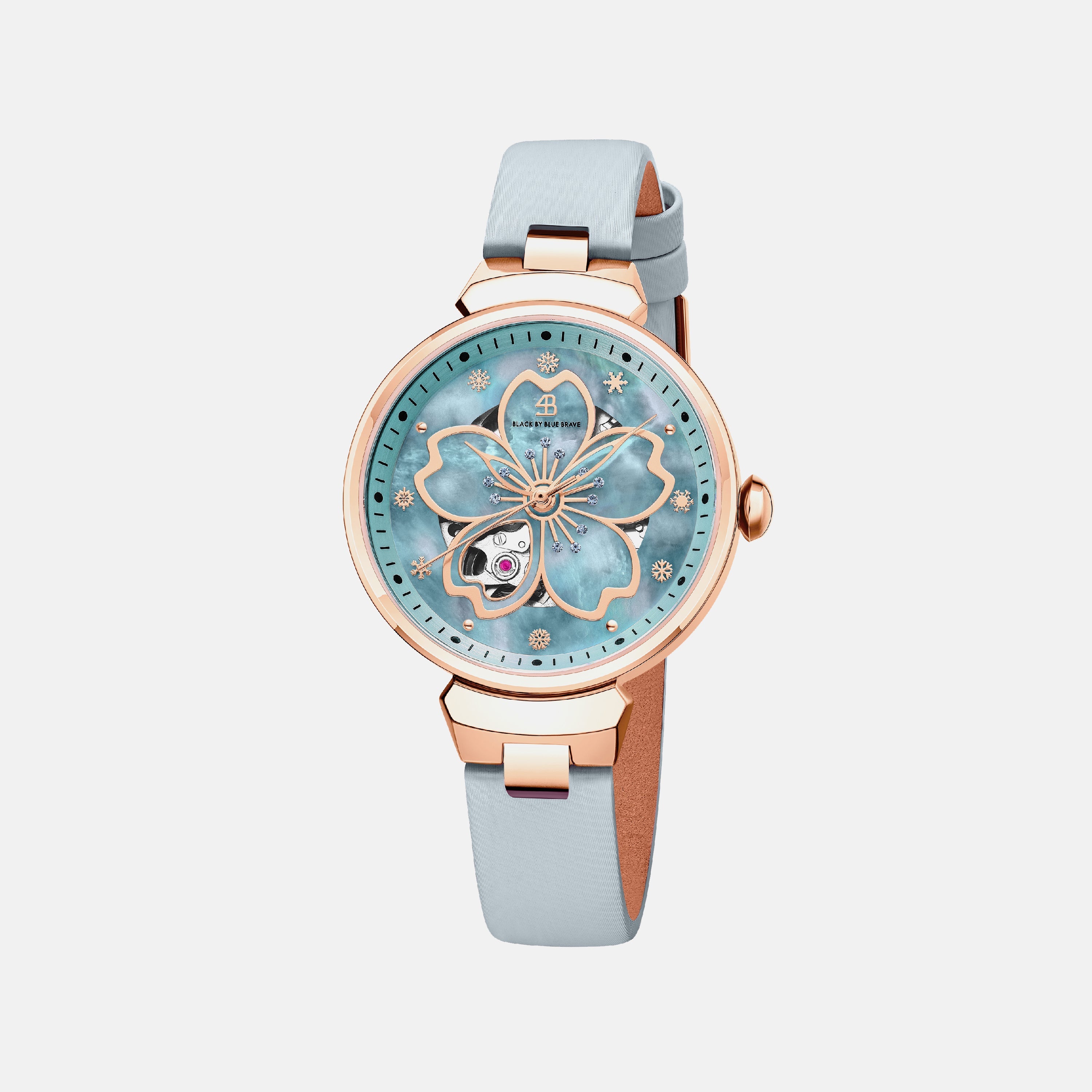 The Cherry Blossom Automatic Blue Watch 36mm by BLACK BY BLUE BRAVE is a refined timepiece that captures the fleeting beauty of cherry blossoms through its signature petal motif and mother-of-pearl dial. Distinctive snowflake-shaped indices and a hollow petal window reveal the intricate automatic movement, blending artistry with precision for a truly elegant wristwatch experience.Versatile enough for both everyday wear and special occasions, this watch pairs effortlessly with both casual and formal attire. Its timeless design complements existing accessories, adding a sophisticated touch to any collection.