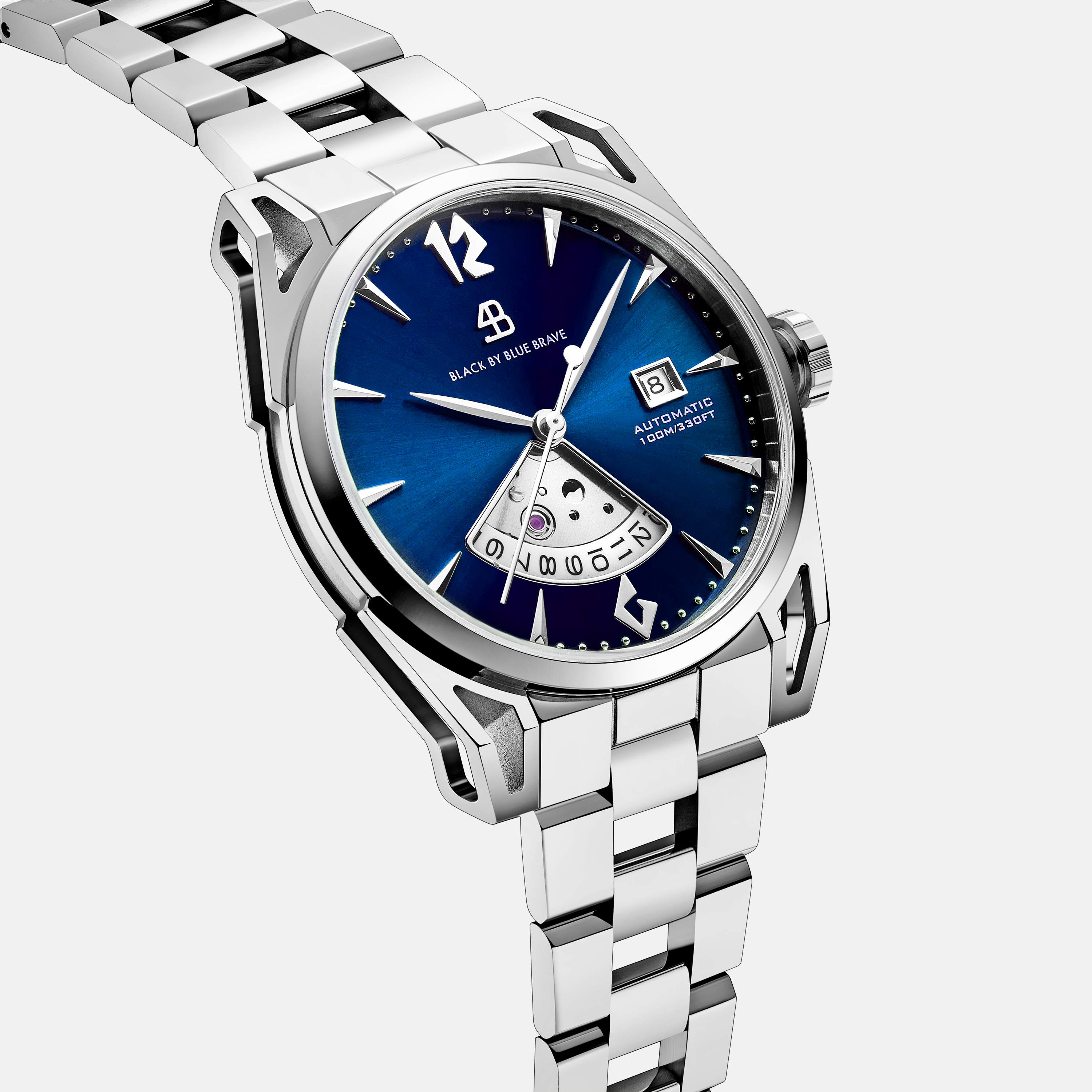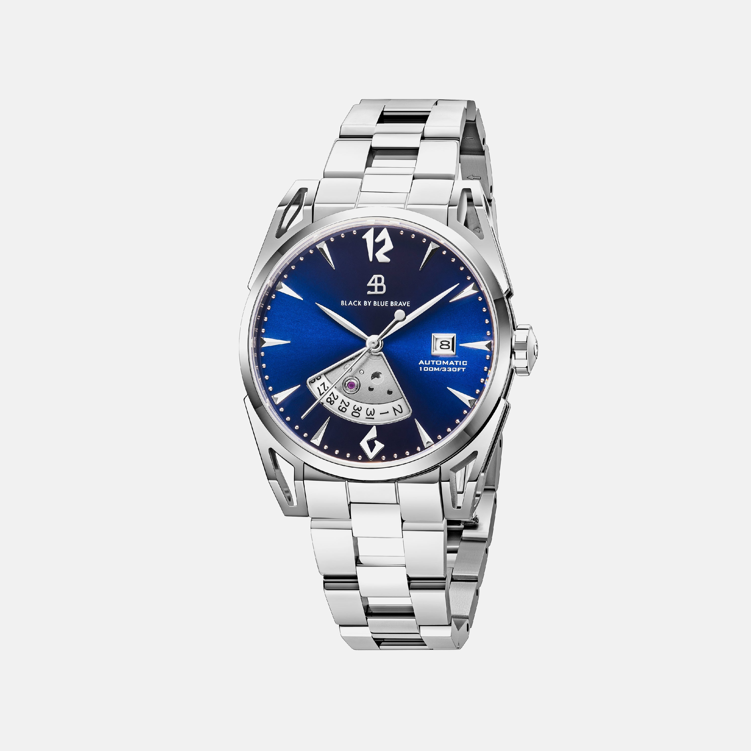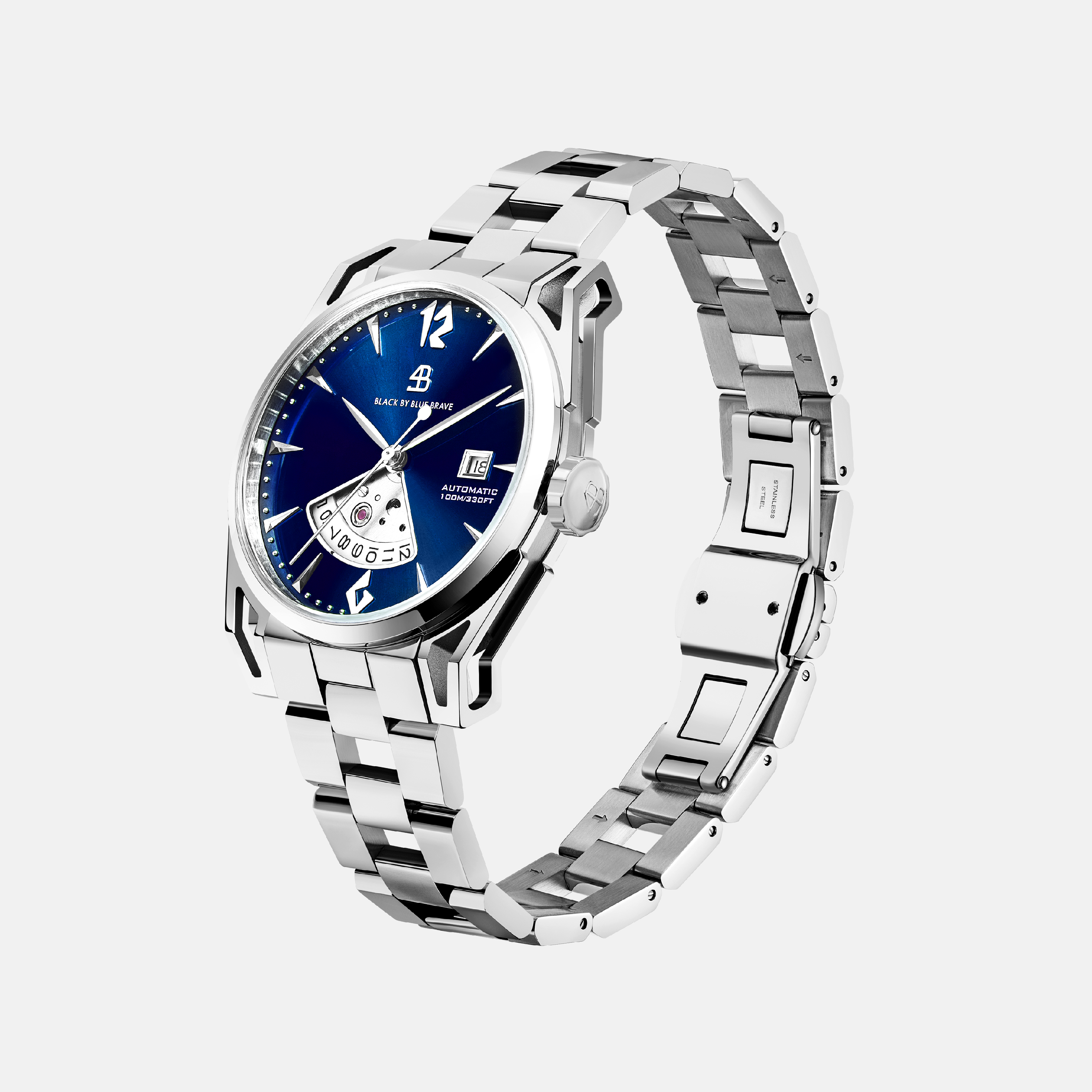 The Blue Classic 2024 Watch by BLACK BY BLUE BRAVE is a refined automatic timepiece that blends tradition with innovation. Its standout feature is a striking skeleton dial from 5 to 8 o’clock, revealing the intricate inner mechanics through a fan-shaped exhibition, all encased in a robust 316L stainless steel frame.Equally suited for formal occasions or everyday wear, this watch elevates any ensemble with its sophisticated design. The versatile stainless steel bracelet complements both business attire and casual outfits, making it a seamless addition to your existing collection.