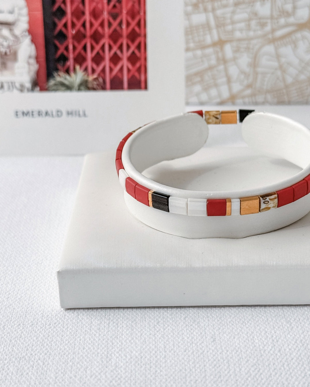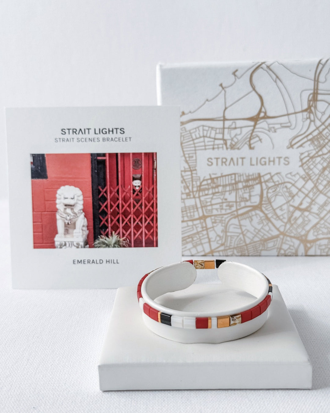 The Emerald Hill Bracelet by STRAIT LIGHTS captures the nostalgic charm of Singapore’s heritage streets, blending deep red, cream sandstone, gold, and black tempered glass beads for a striking, timeless accessory. Inspired by the iconic One Price Store, this bracelet offers a refined nod to local history while providing a comfortable fit with its soft elastic design.