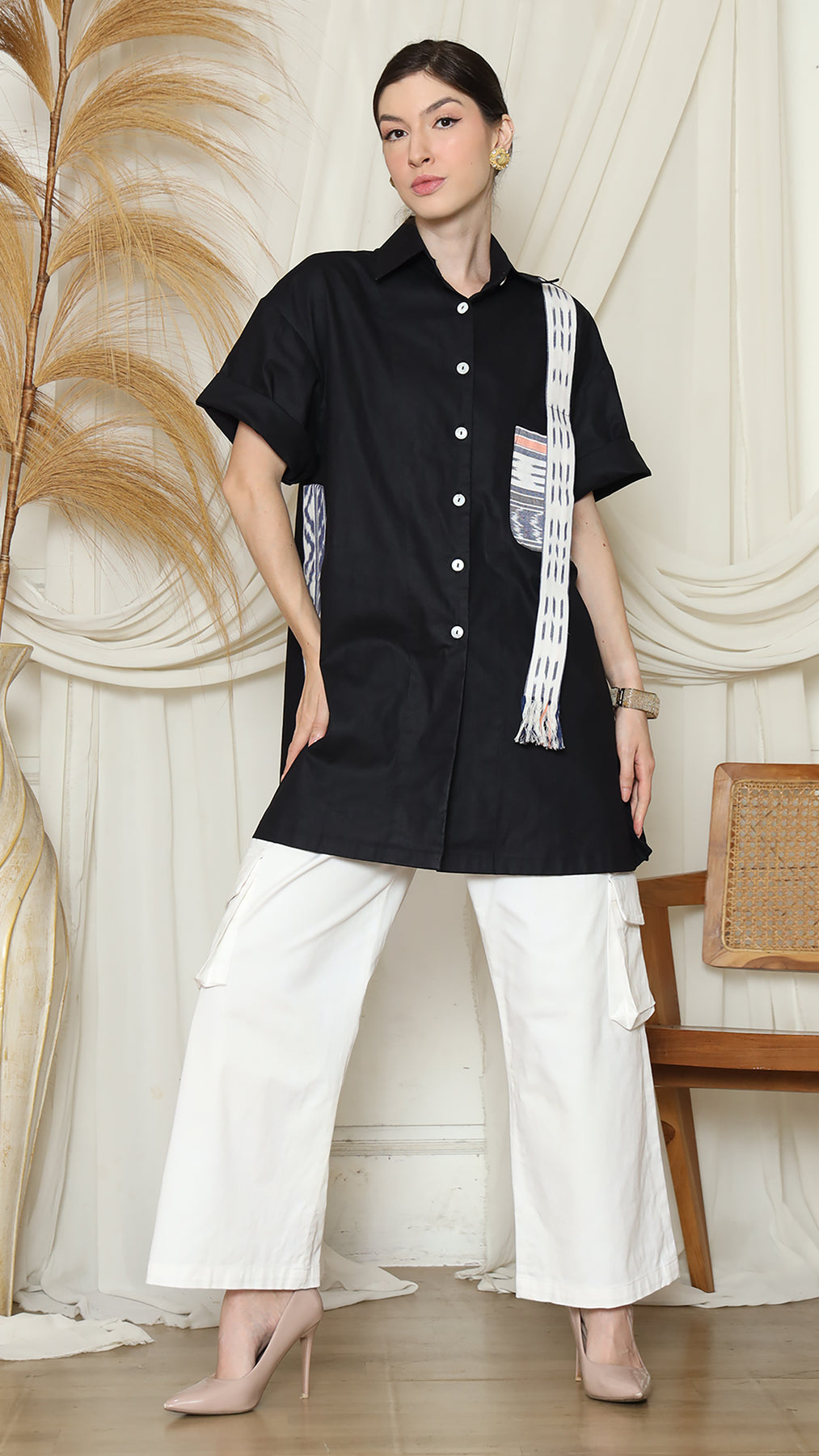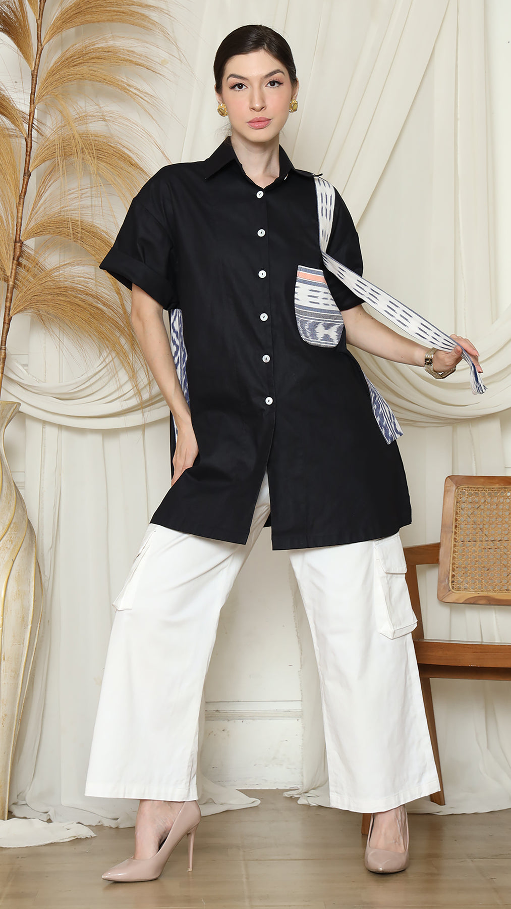 Elevate your everyday wardrobe with the KANZI COLLECTION Black Ikat Tunic Oversized Top, a modern interpretation of classic design. Crafted from a soft, breathable cotton blend, this top offers a relaxed silhouette and an open front button detail for effortless sophistication.Versatile enough for both casual outings and refined gatherings, this oversized tunic pairs beautifully with tailored trousers or your favourite jeans. Its timeless black ikat pattern complements a variety of styles, making it a seamless addition to any closet.