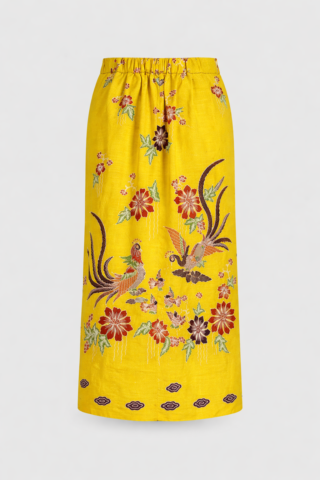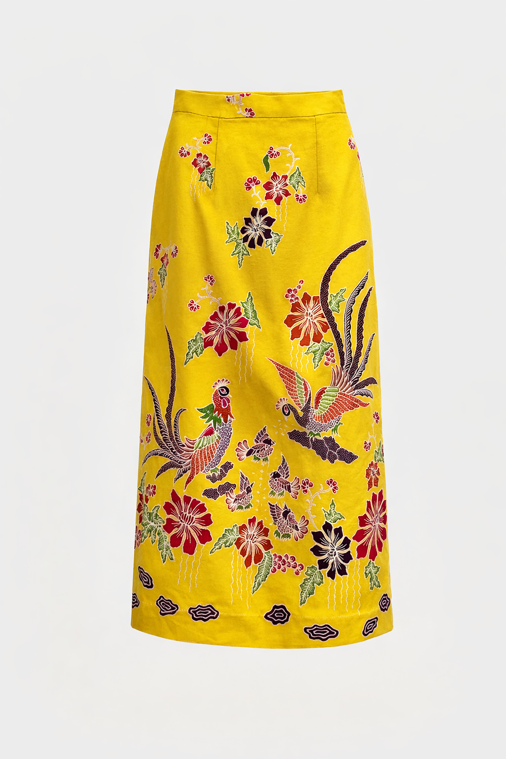 Radiant and expressive, the Merak Soleil Batik Column Skirt brings the vibrancy of traditional batik to a modern silhouette. Set against a striking sunshine yellow base, the design features intricate hand-drawn batik motifs of flourishing florals and graceful merak (peacocks), symbols of beauty, prosperity, and renewal.