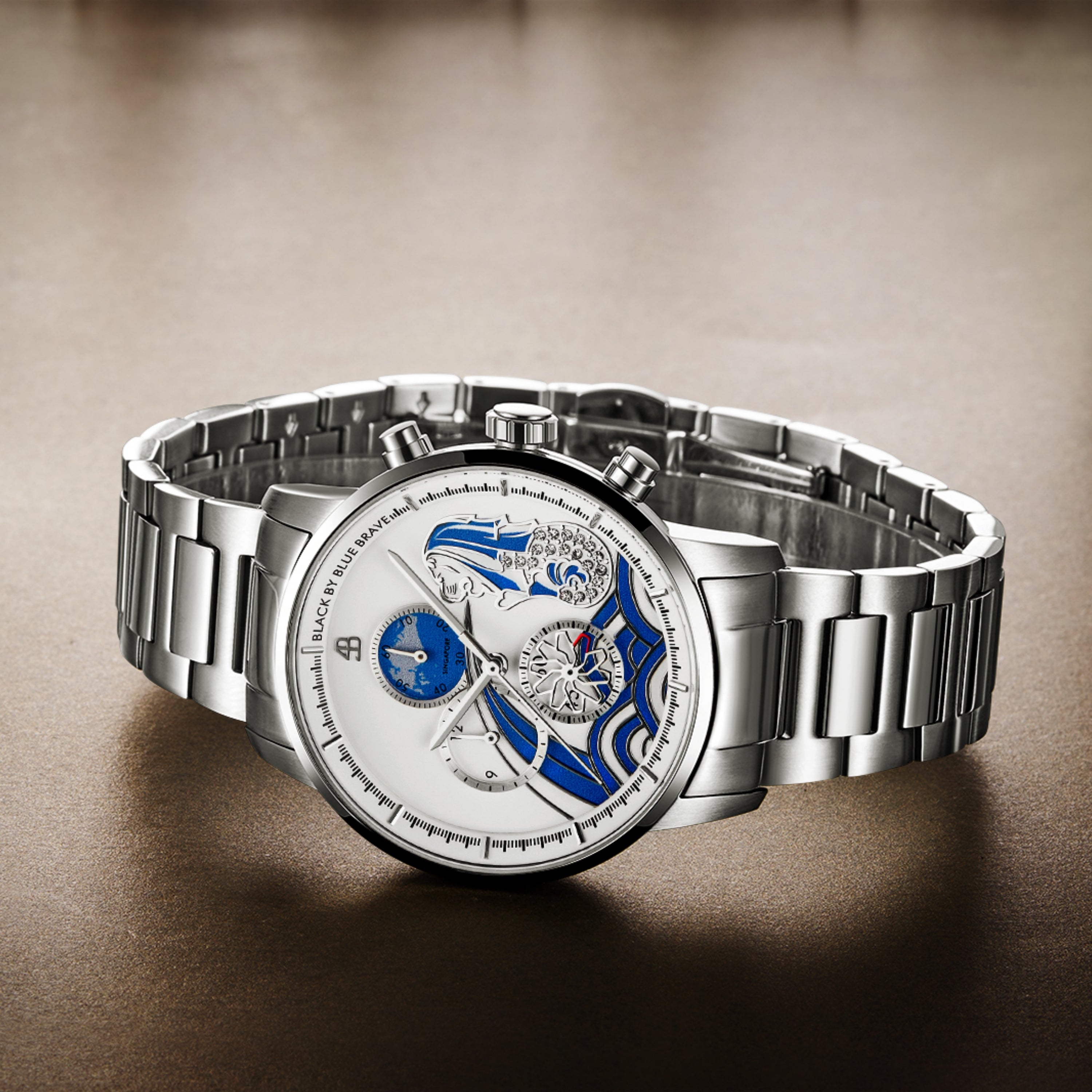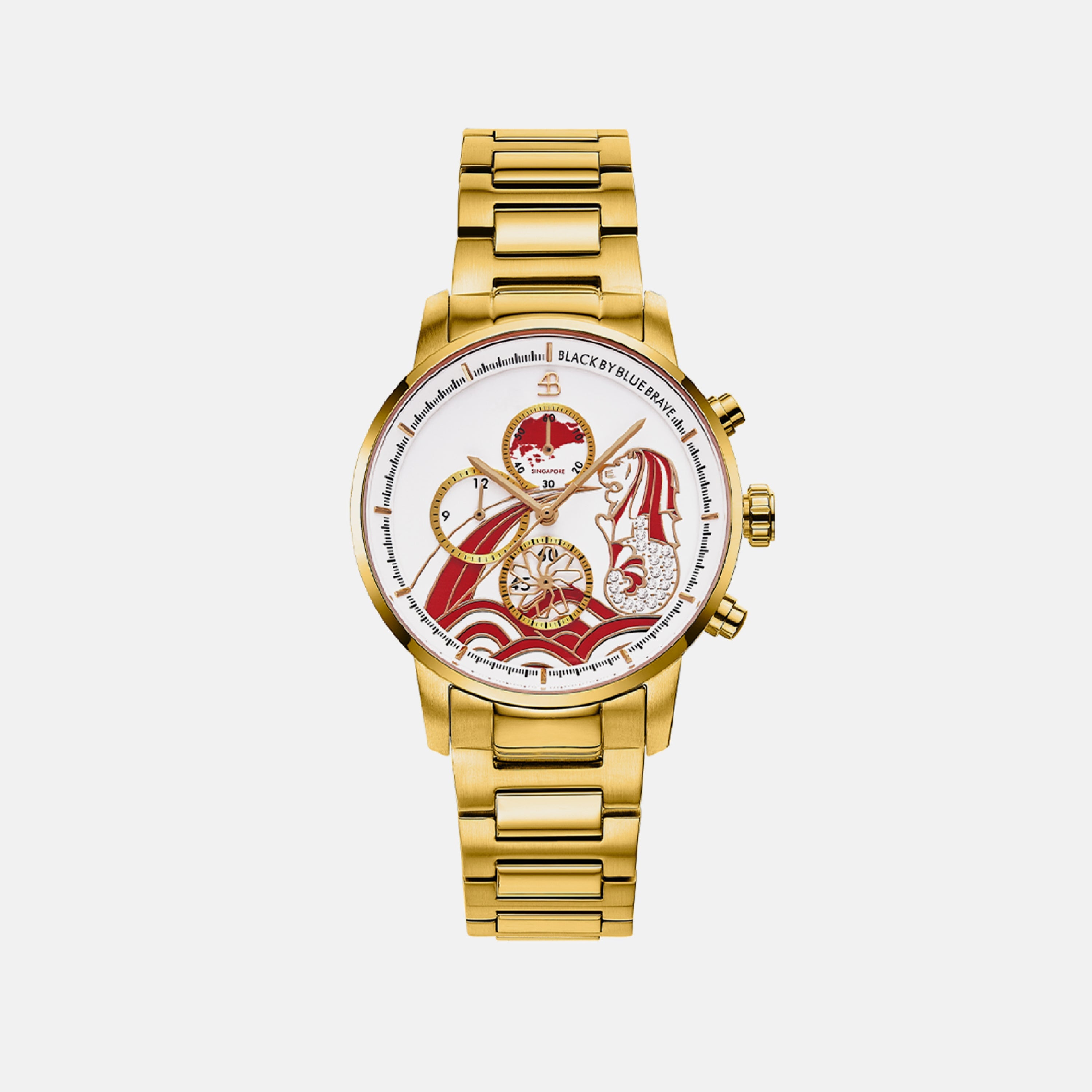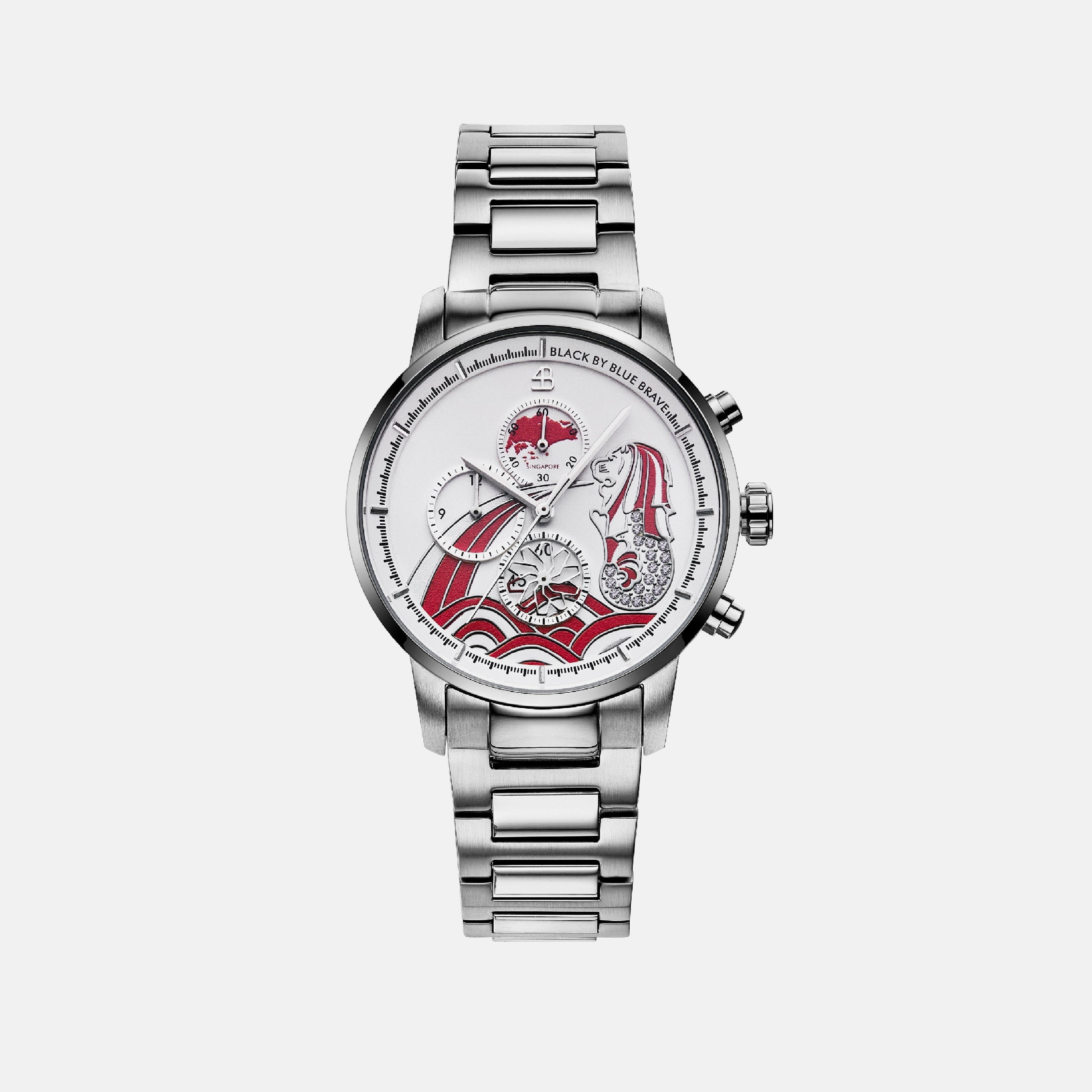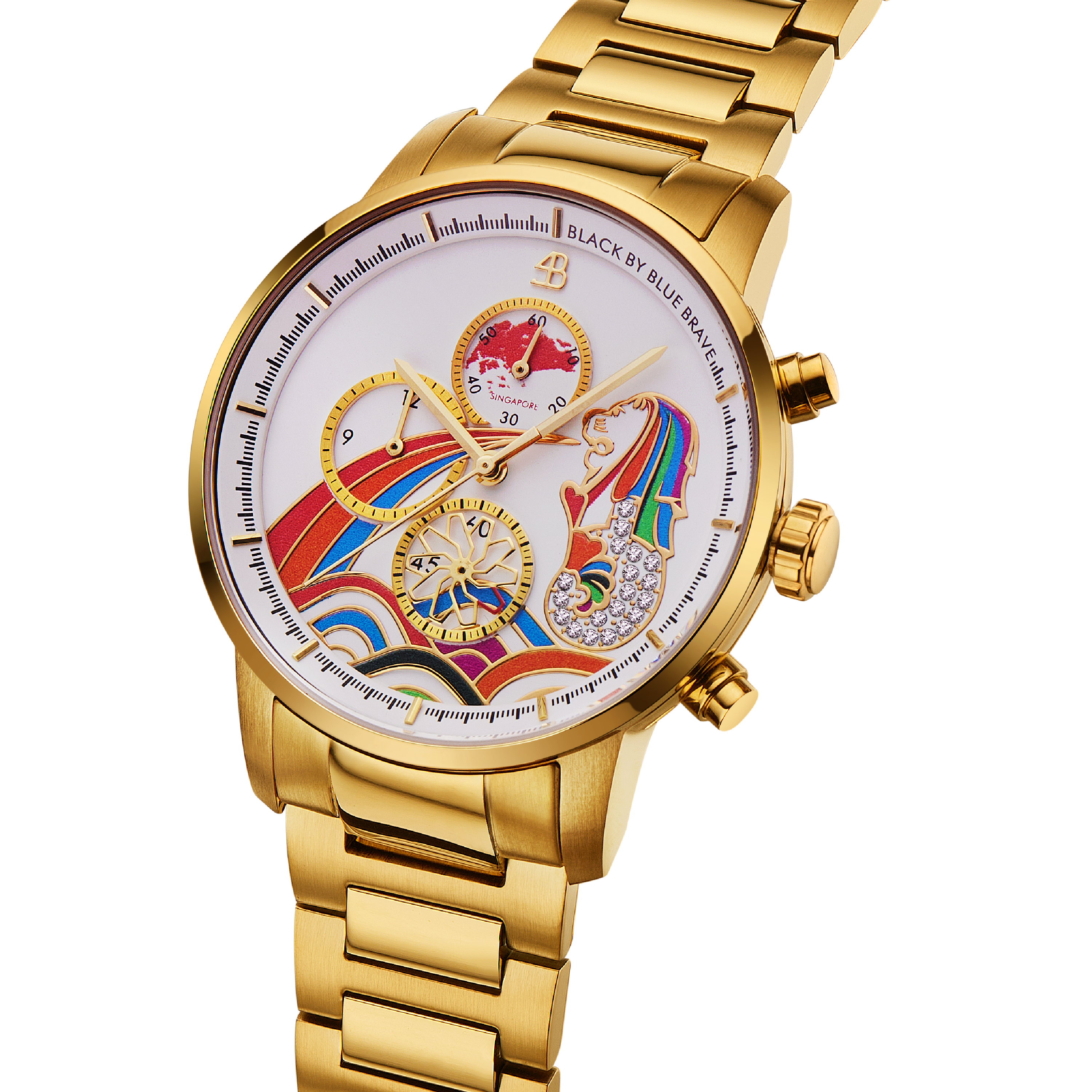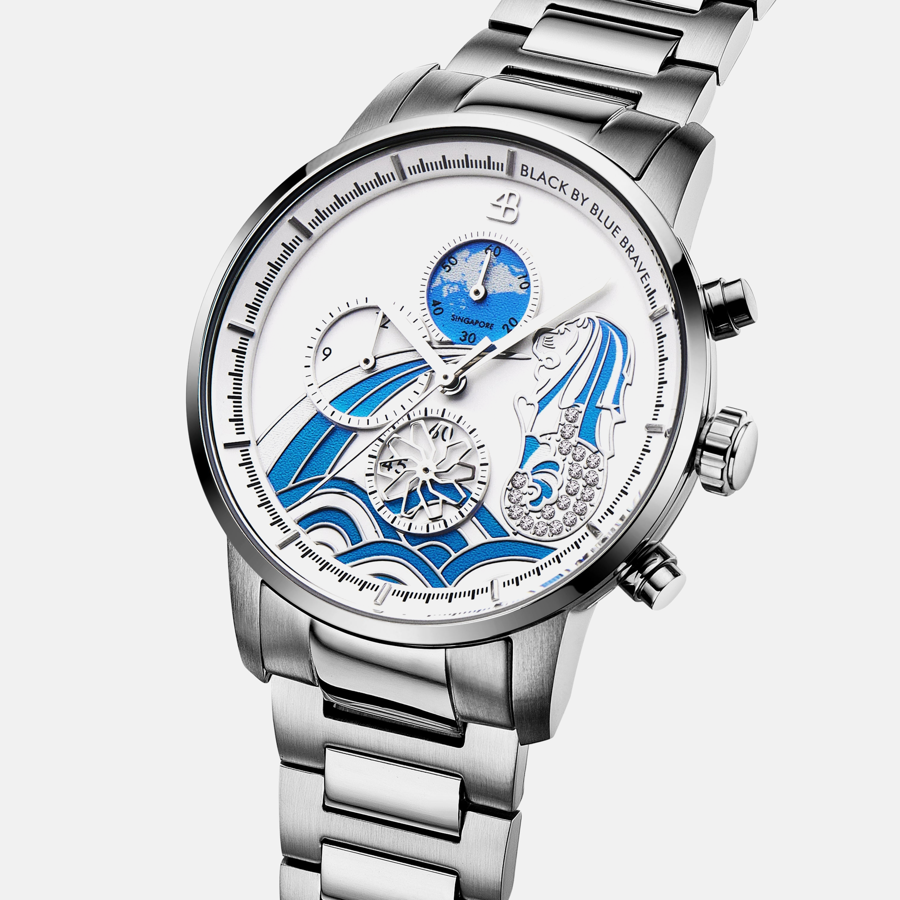 Celebrate Singapore’s spirit of transformation with the Merlion Watch by BLACK BY BLUE BRAVE, a 40mm timepiece that artfully blends heritage and modernity. Distinctive crystal embellishments evoke the iconic Merlion, while sub-dials inspired by the Singapore map and Singapore Flyer add unique cultural depth.This watch transitions seamlessly from formal occasions to everyday wear, making it a versatile addition to any collection. Its commemorative design pairs well with both classic and contemporary styles, complementing your existing accessories.