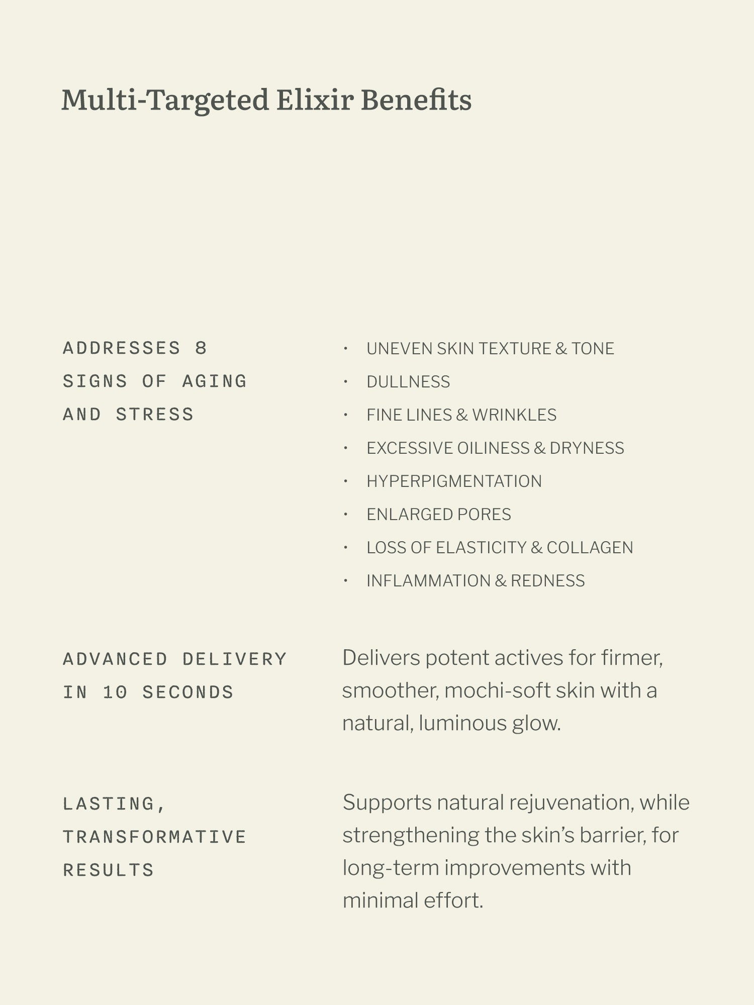 Experience skin, soft like mochi. Infused with our exclusive Japanese White Turmeric, Japanese Spring Turmeric, and APPS, it targets multiple signs of aging and stress. Absorbing in just 10 seconds, it rejuvenates skin to its optimal condition, to reveal a healthier, more radiant complexion with every use.