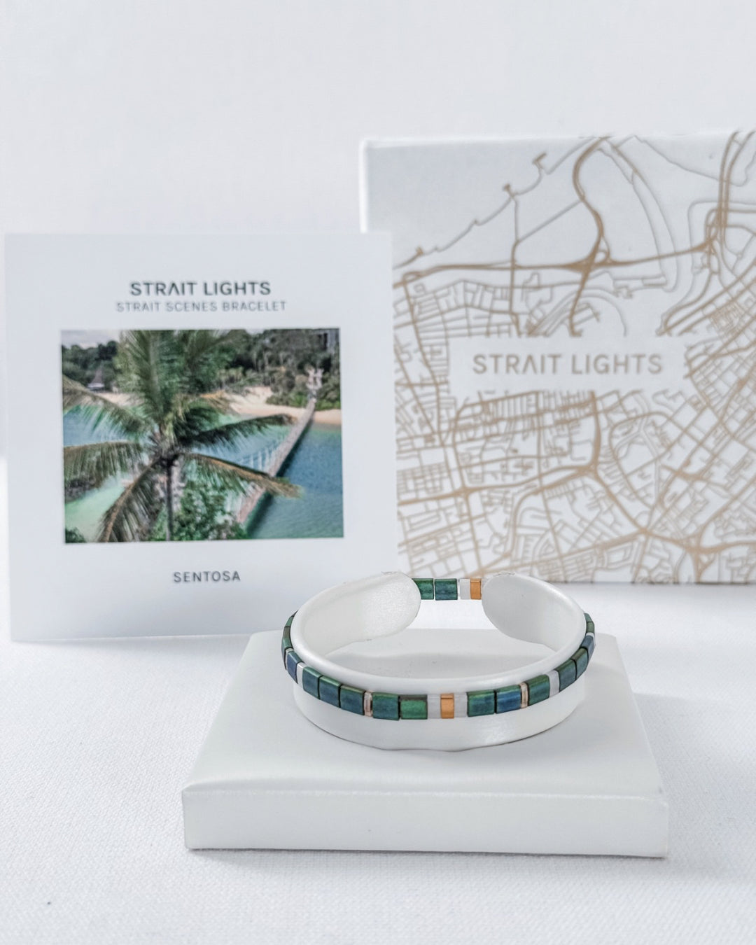 Inspired by the tranquil ombré blues of Palawan Beach and lush green palms, the Sentosa Bracelet by STRAIT LIGHTS captures the essence of Singapore’s southern coast. Matte and lustrous tempered glass beads are thoughtfully arranged, offering a refined accessory that evokes a sense of escape and serenity.