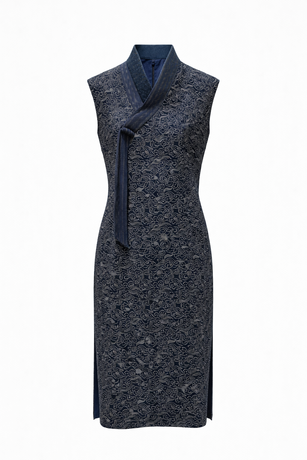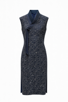 Sleek and sculptural, the Peter Kor Midnight Cloud Wrap Cheongsam Dress is a contemporary expression of traditional elegance. Crafted in a deep navy fabric adorned with subtle cloud-inspired motifs, this sleeveless cheongsam features a distinctive wrap-style mandarin collar finished with a soft knotted detail for understated sophistication.