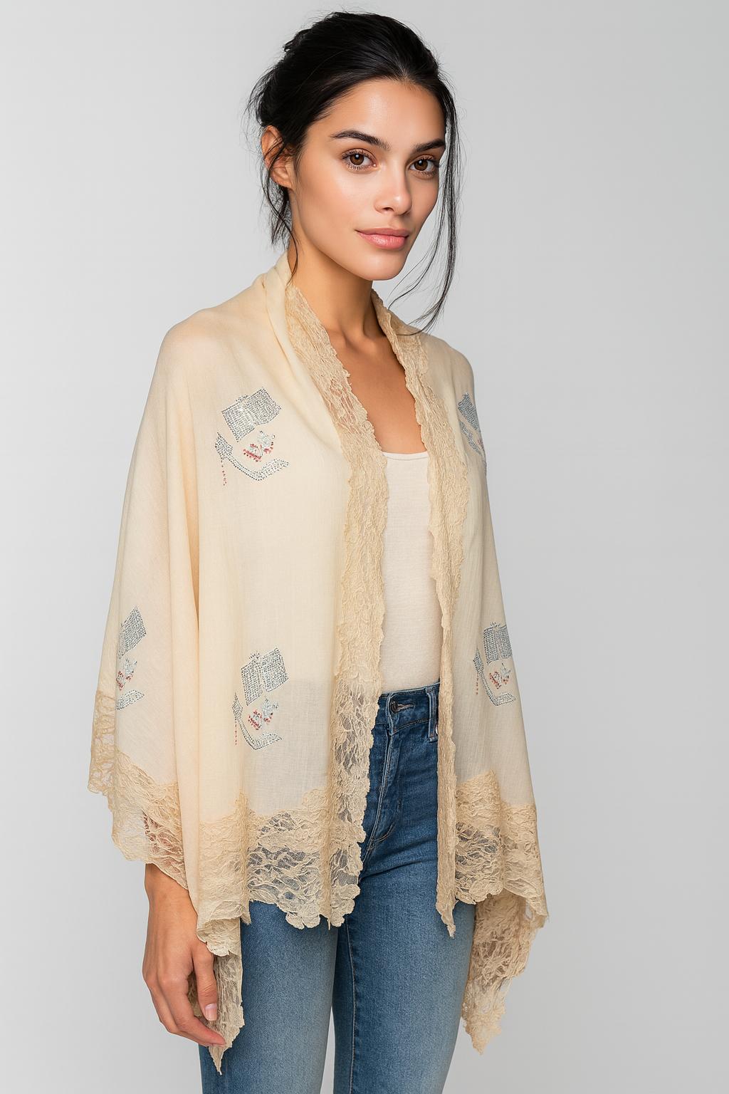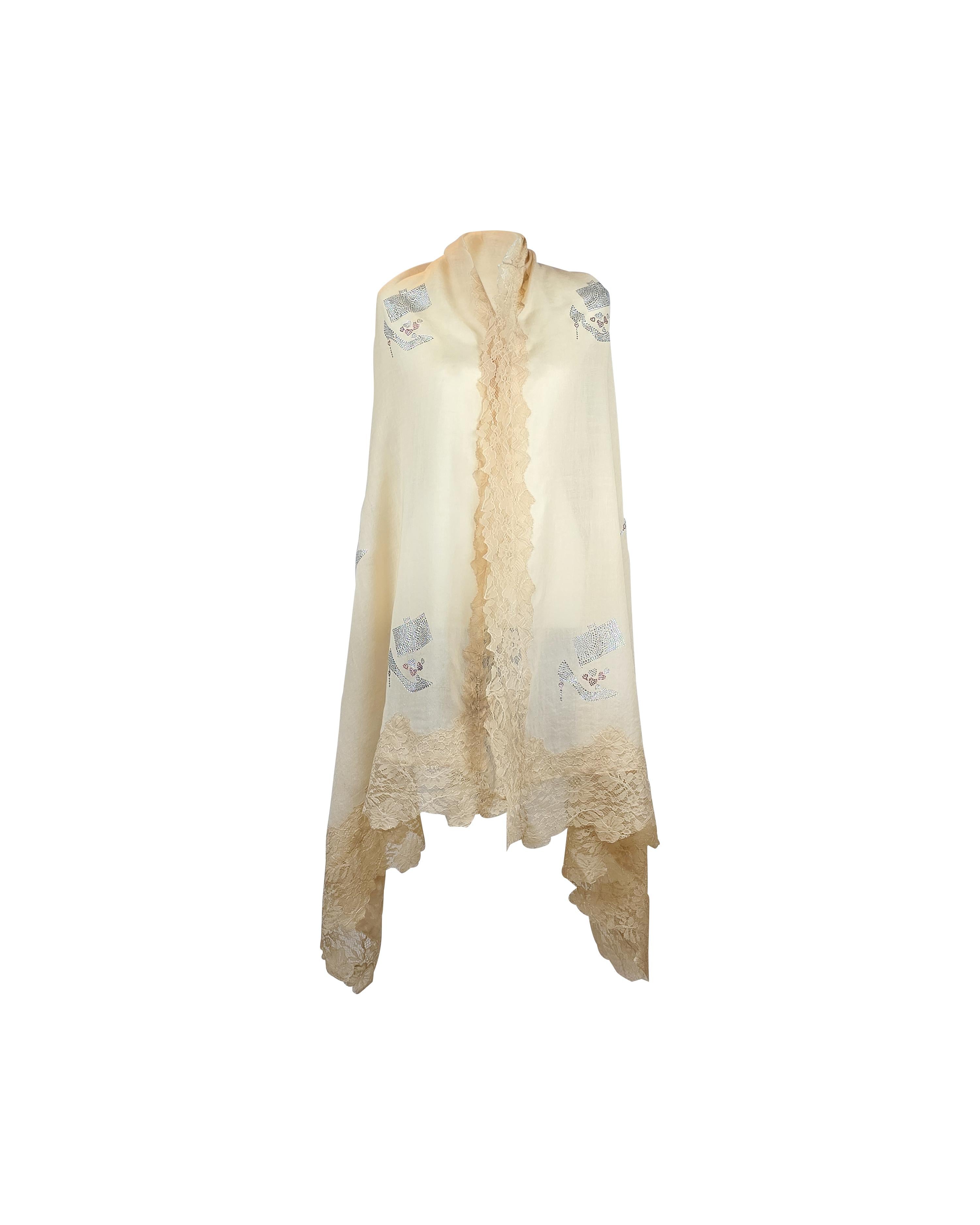 QUEENMARK’s AN EMB I Love My Shoes Bag 4 Side Lace shawl brings a playful touch to your wardrobe, featuring whimsical embroidered motifs and framed by delicate lace on every edge. The luxurious cashmere silk blend offers a soft, elegant drape that elevates any look.This versatile shawl transitions effortlessly from casual daywear to evening ensembles. Drape it over your shoulders for a chic accent or style it as a statement accessory to complement your favourite outfits.