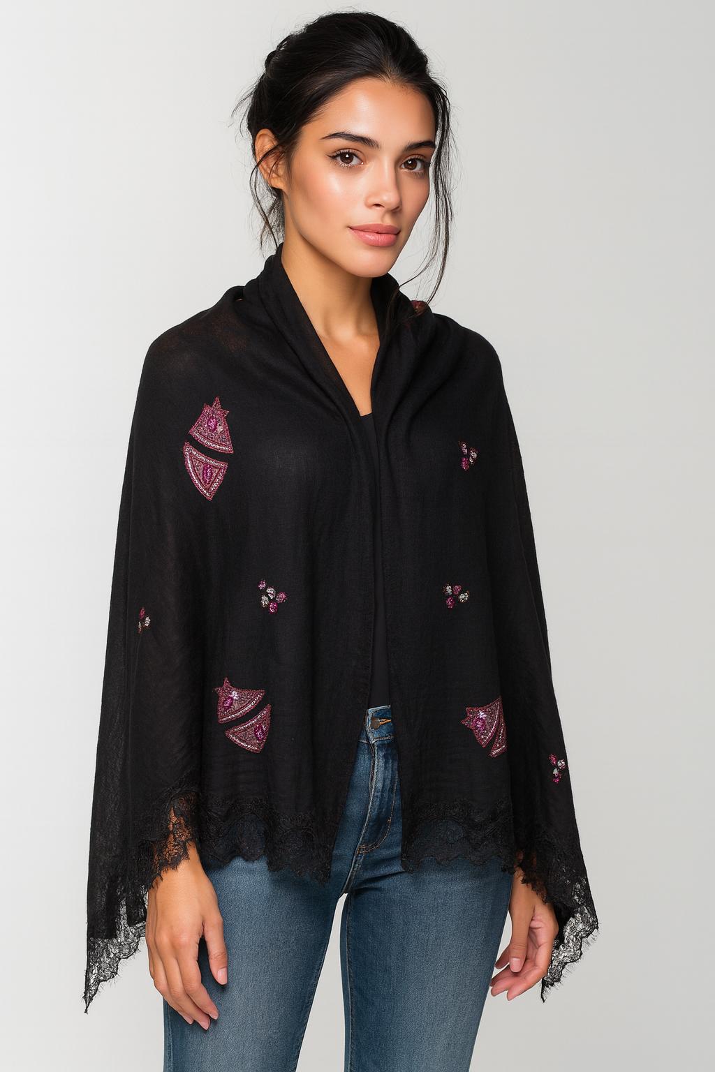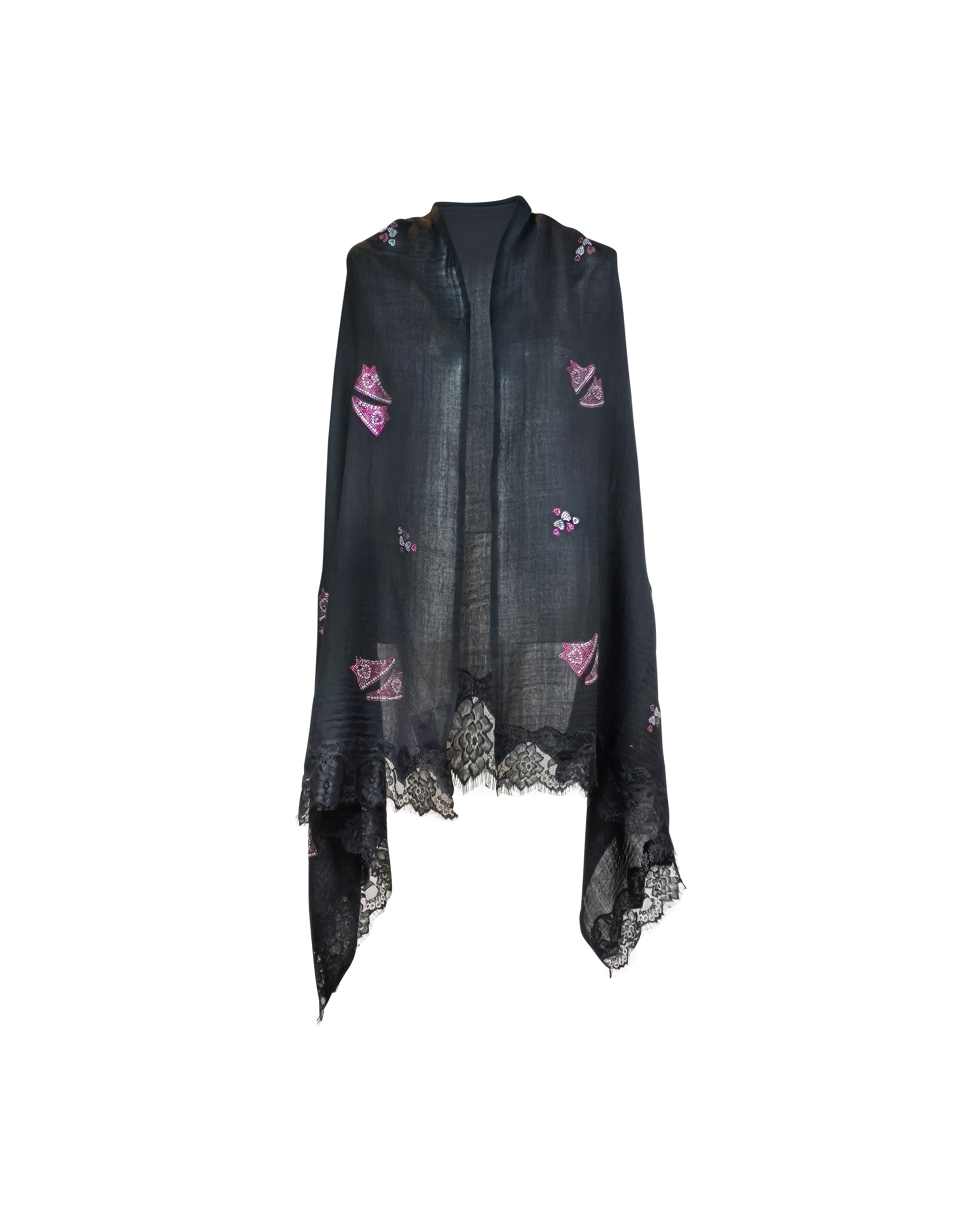 Expertly crafted from a luxurious cashmere silk blend, this shawl promises lasting softness and comfort. The quality materials and detailed embellishments ensure it remains a cherished accessory season after season.