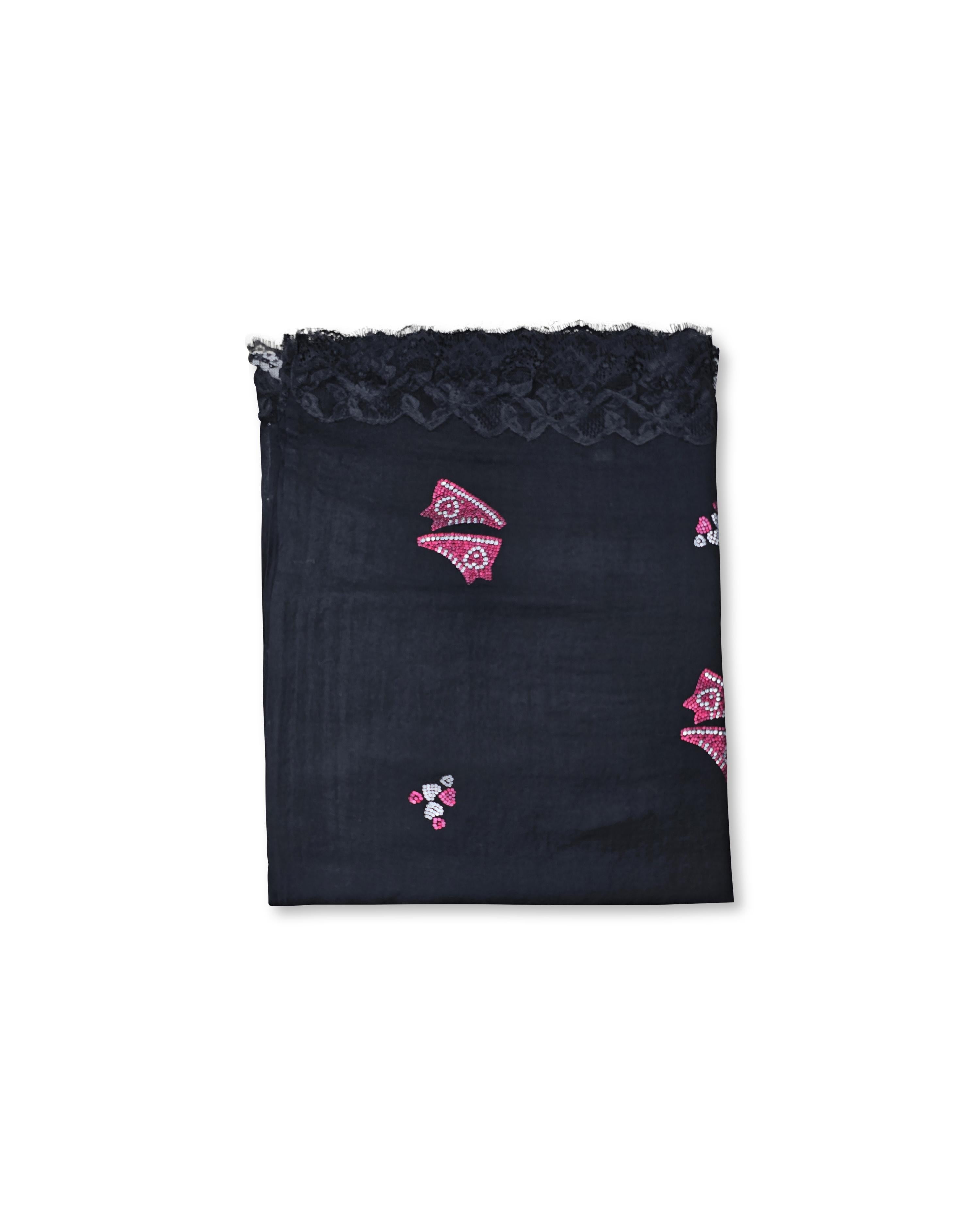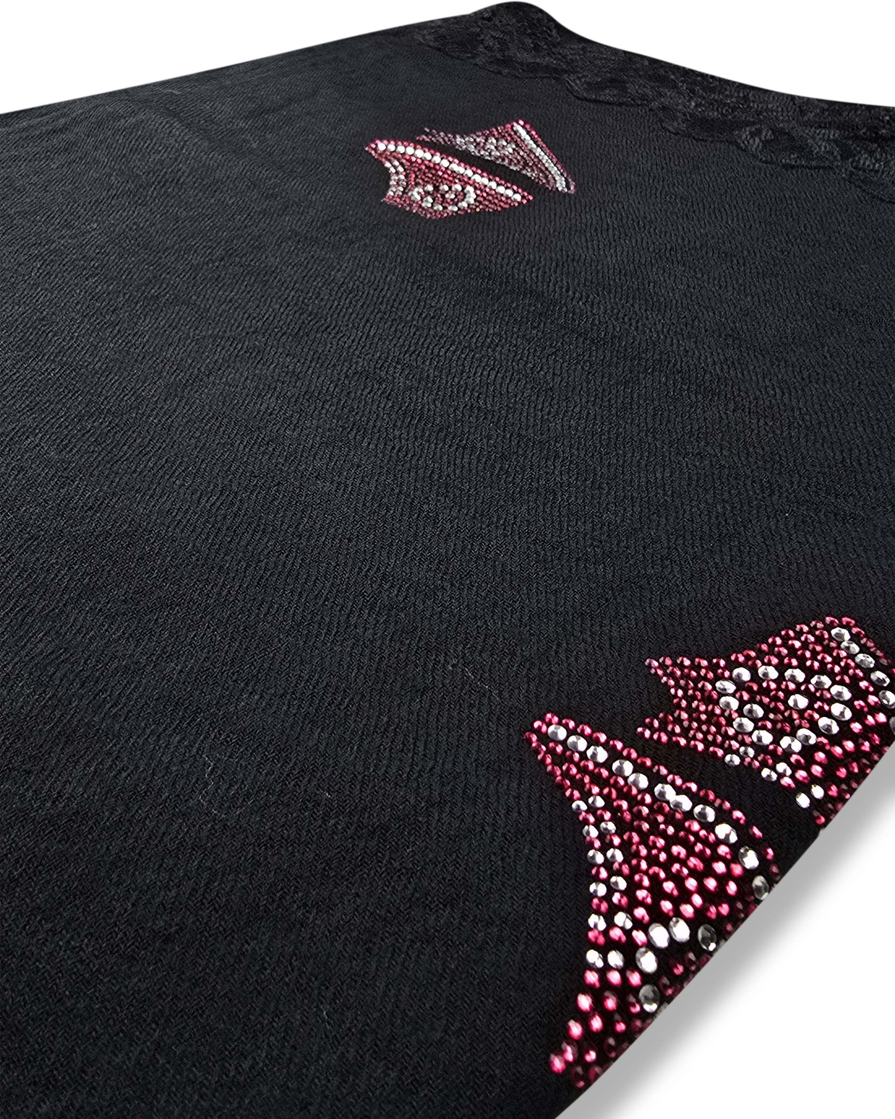 QUEENMARK’s AN EMB Pallo Shoe Design Crystal Work 12 shawl brings a contemporary edge to classic elegance, featuring whimsical embroidered shoe motifs and sparkling crystal accents on a sleek black cashmere silk blend. The addition of delicate lace trim offers a refined, modern finish that elevates this accessory beyond the ordinary.Drape it over your shoulders for a sophisticated evening look, or layer it with casual ensembles to add a touch of playful glamour. Its versatile design complements both traditional and modern wardrobes, making it a standout piece for any occasion.