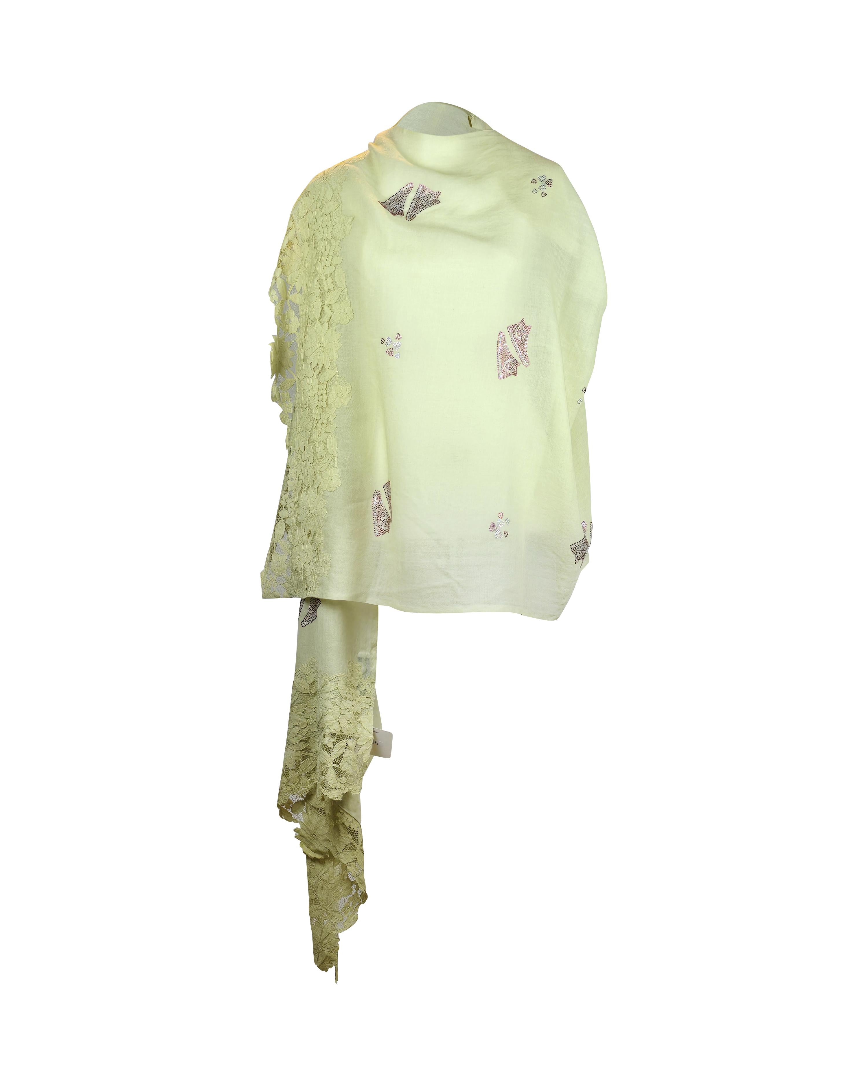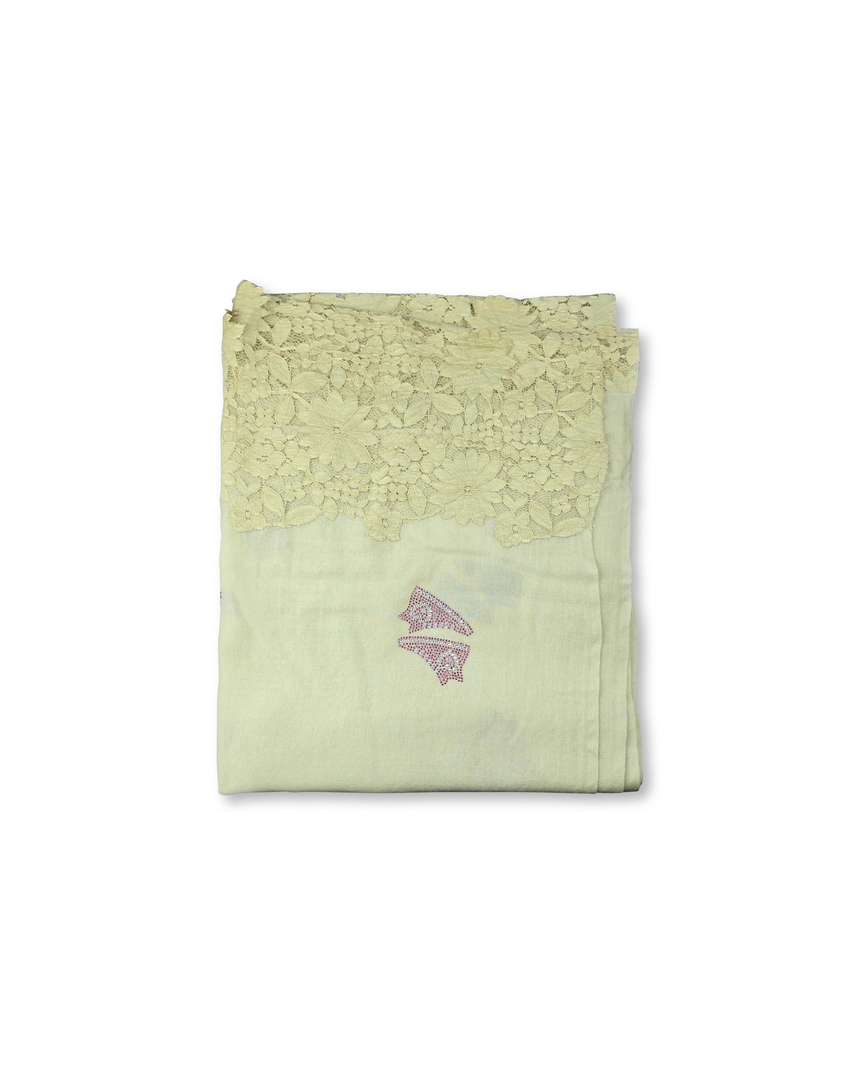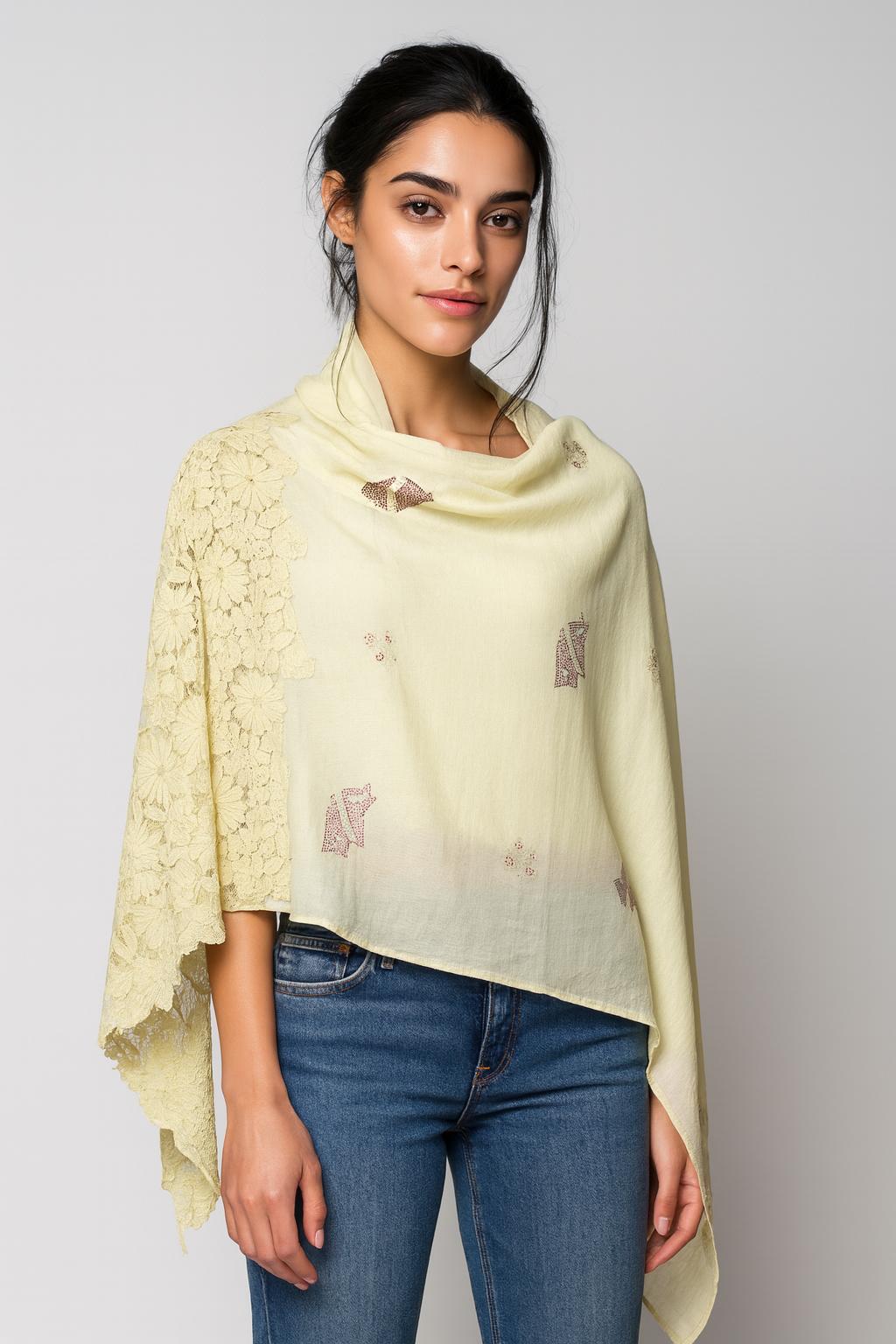 Elevate your wardrobe with the QUEENMARK AN EMB pallo shoe design crystal work 12a shawl, featuring intricate embroidery and whimsical shoe motifs. Delicate crystal accents and lace trim add a refined, elegant finish to this cashmere silk blend piece.This versatile shawl transitions effortlessly from day to evening, draping beautifully over both casual and formal ensembles. Its unique design complements classic outerwear and adds a playful twist to your existing collection.
