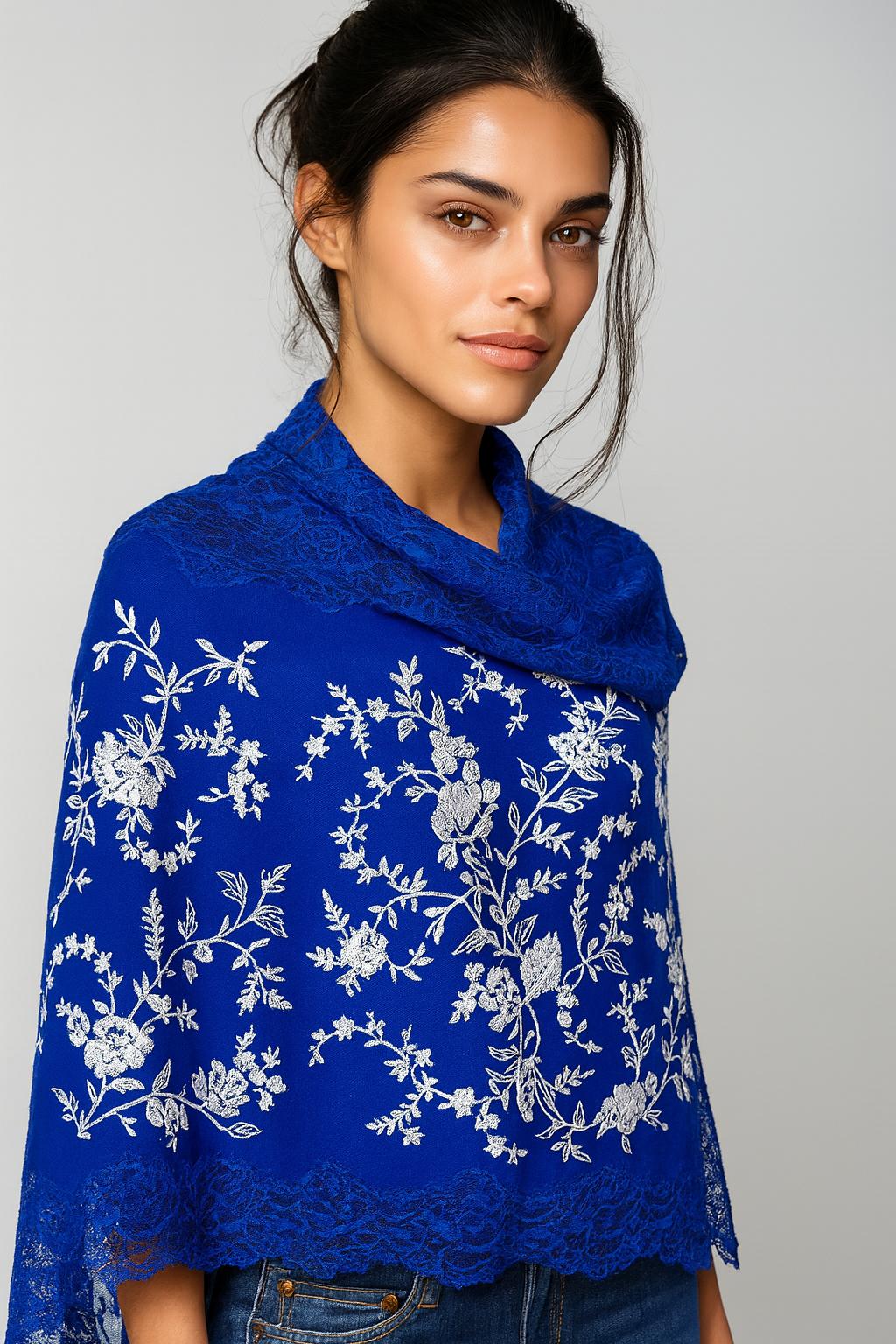 QUEENMARK’s Maj Assortment 1 Blue White Flowers shawl captivates with its rich cobalt merino wool, beautifully embroidered with delicate white florals and finished with an elegant lace trim. This refined accessory brings a touch of sophistication to any ensemble, making it a standout piece in your wardrobe.Drape it over your shoulders for a formal evening, layer it with casual outfits for a chic daytime look, or use it as a statement wrap for special occasions. Its versatile design complements both classic and contemporary styles, enhancing what you already own.