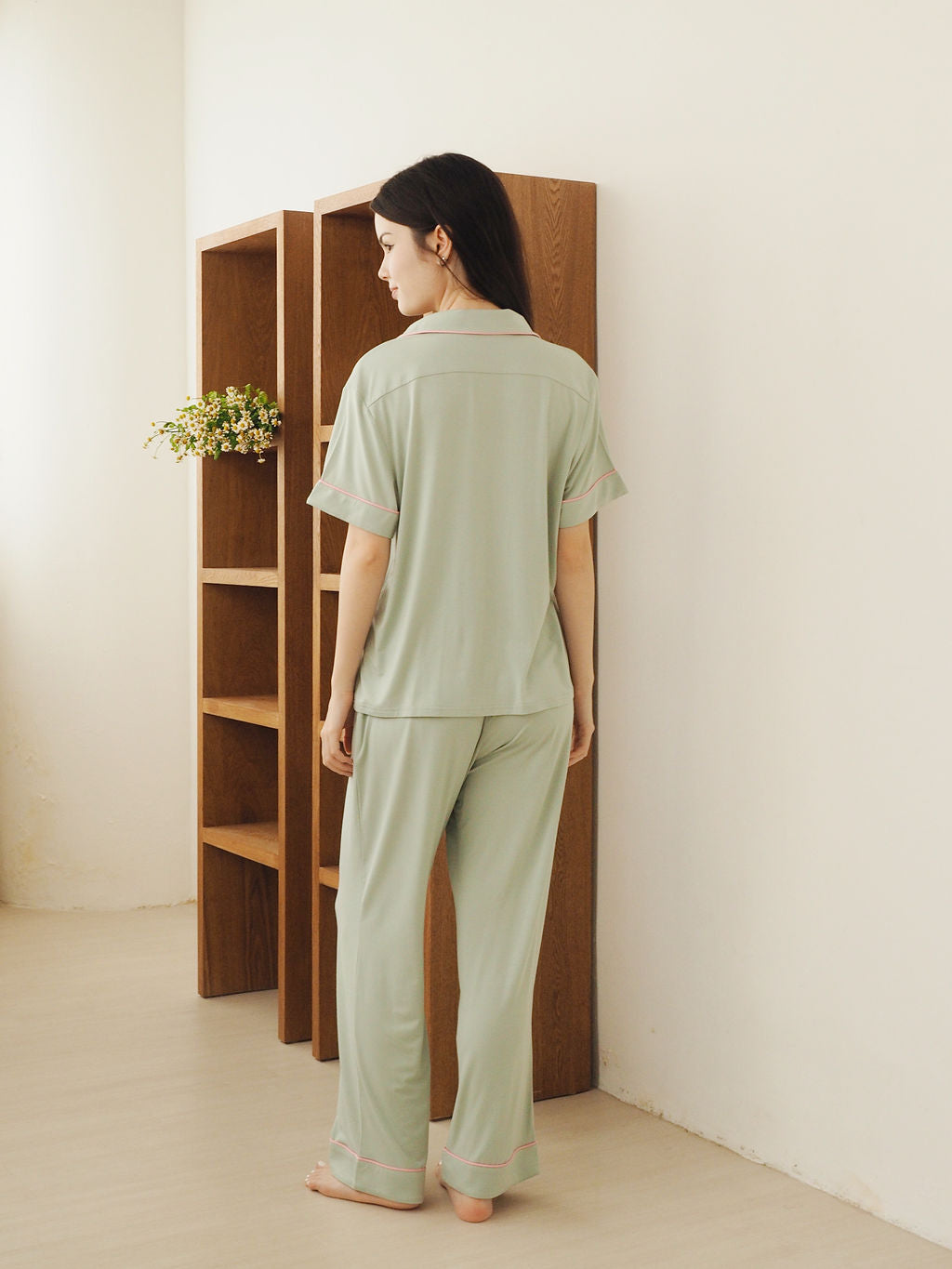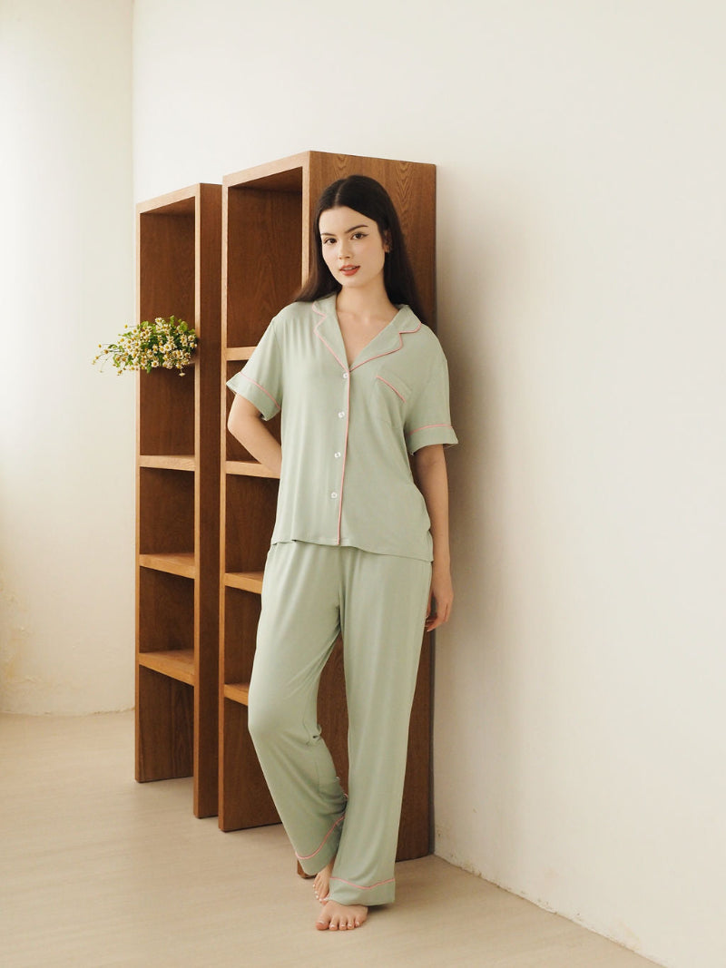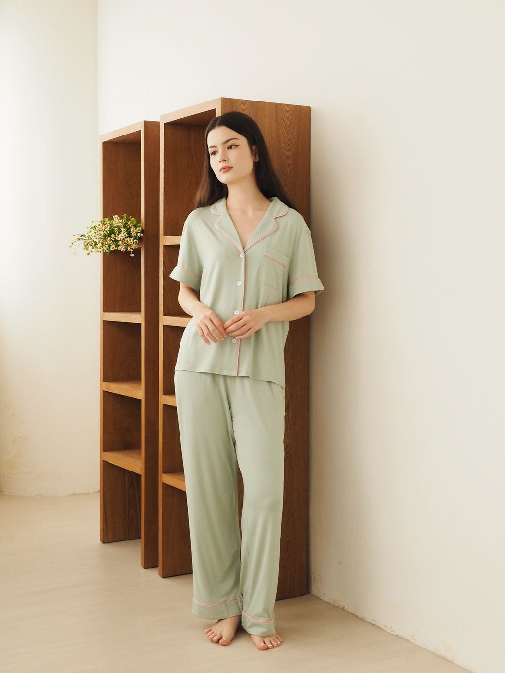 Experience elevated comfort with the SELENIGHT CO Signature Pants Set in Spring Green, crafted from a premium bamboo and elastane blend. This set stands out for its breathable, thermoregulating fabric and refined contrast piping, ensuring both style and ease for restful nights.