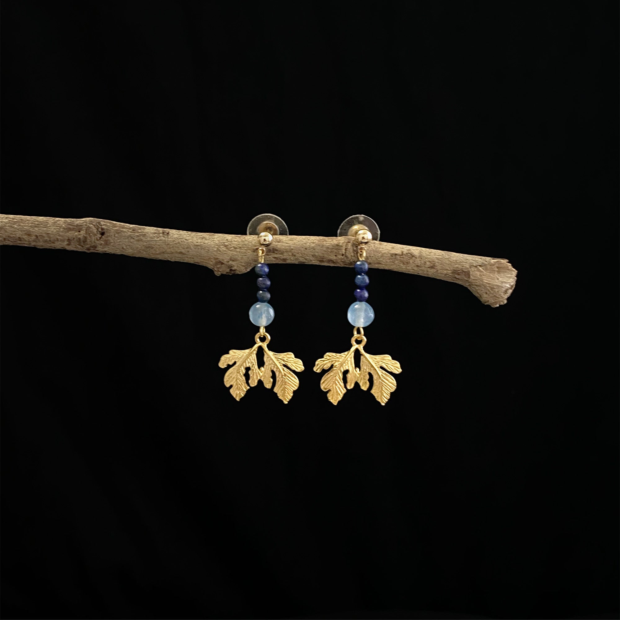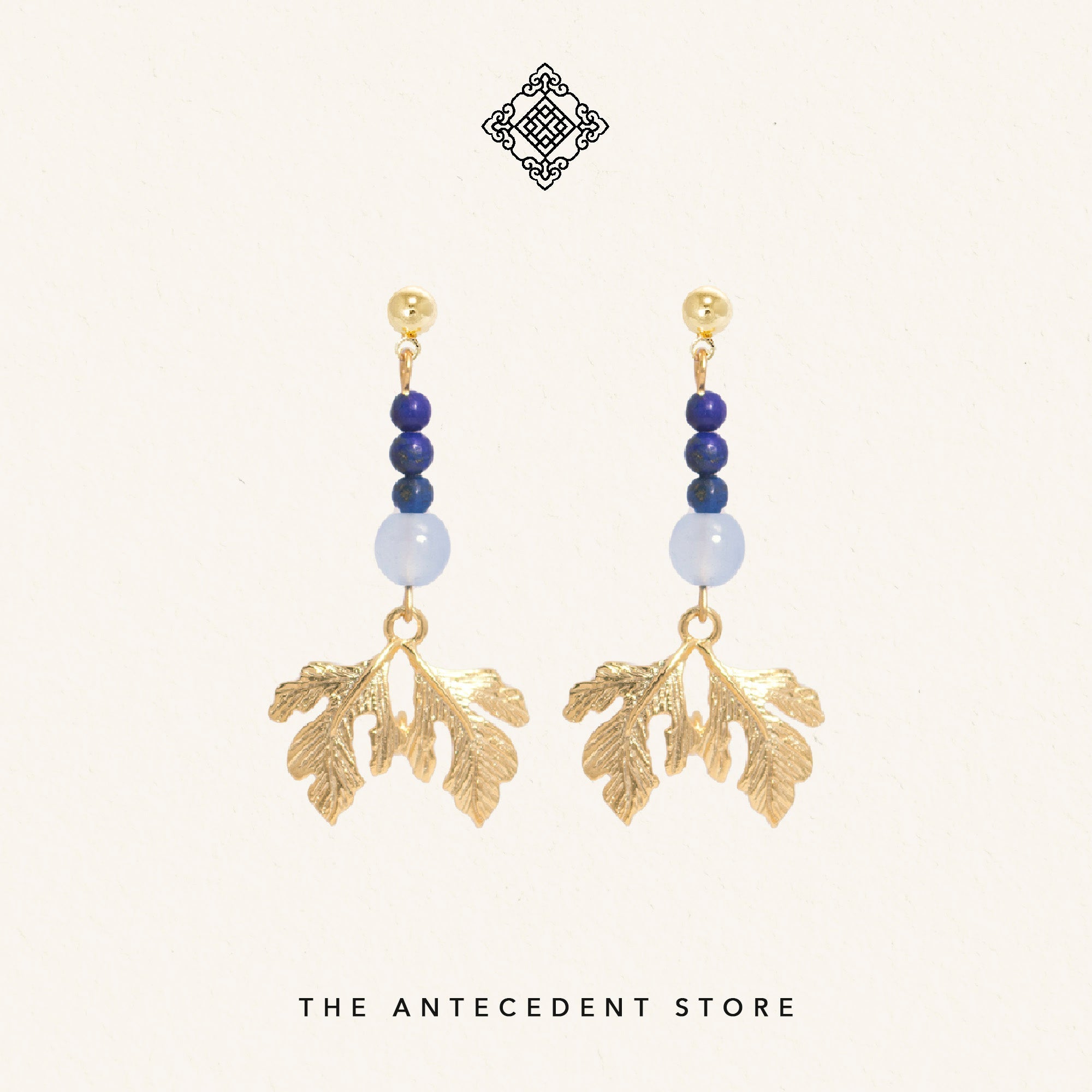 Celebrate timeless elegance with The Antecedent Store Ginkgo Leaf Earrings, featuring a graceful silhouette inspired by the iconic Ginkgo leaf. Accented with Lapis Lazuli and Aquamarine semi-precious stones, these earrings evoke a sense of resilience and enduring beauty.Perfect for both everyday wear and special occasions, these earrings add a refined touch to casual outfits or elevate evening ensembles. Their versatile design complements a variety of jewellery collections, making them a thoughtful addition to any wardrobe.