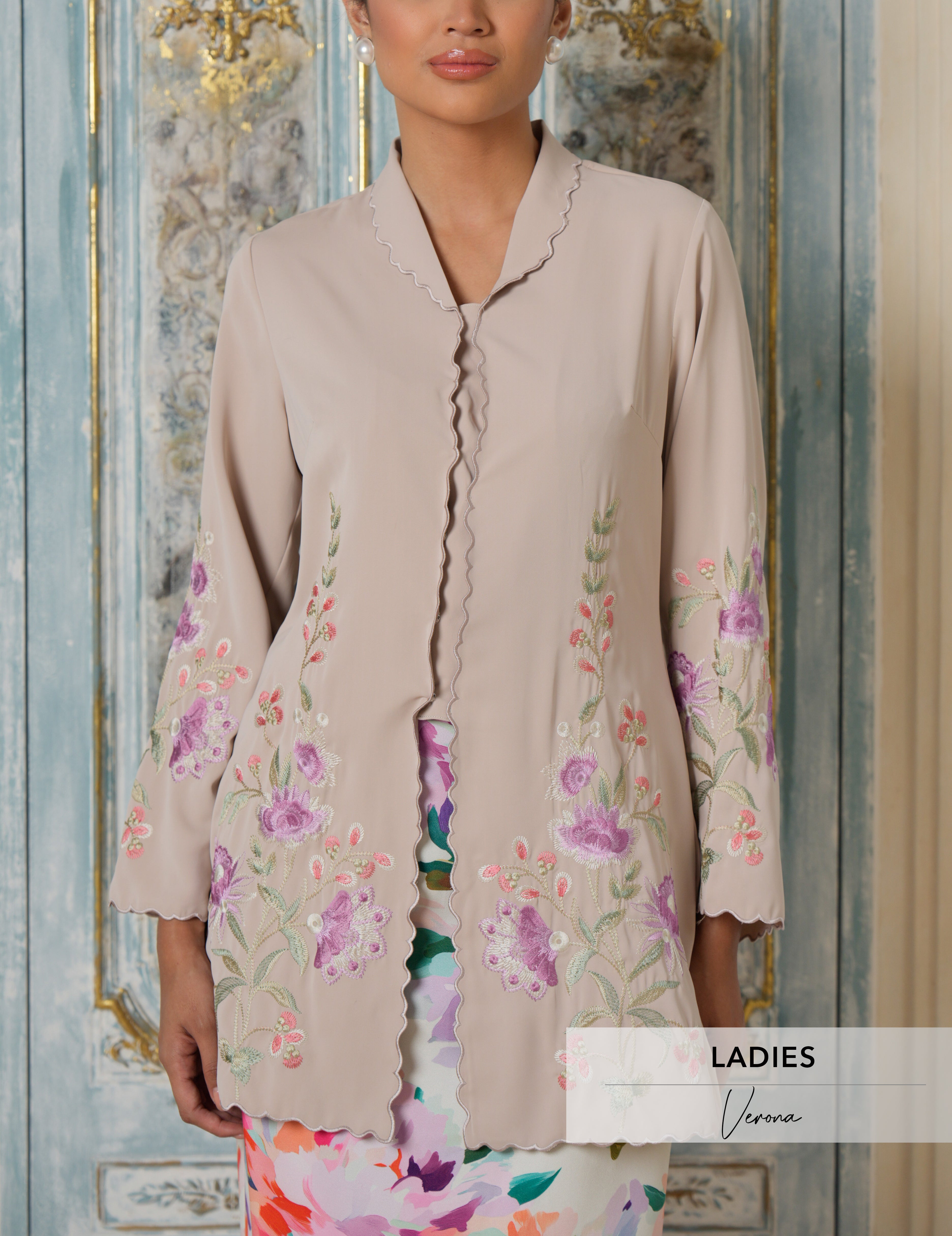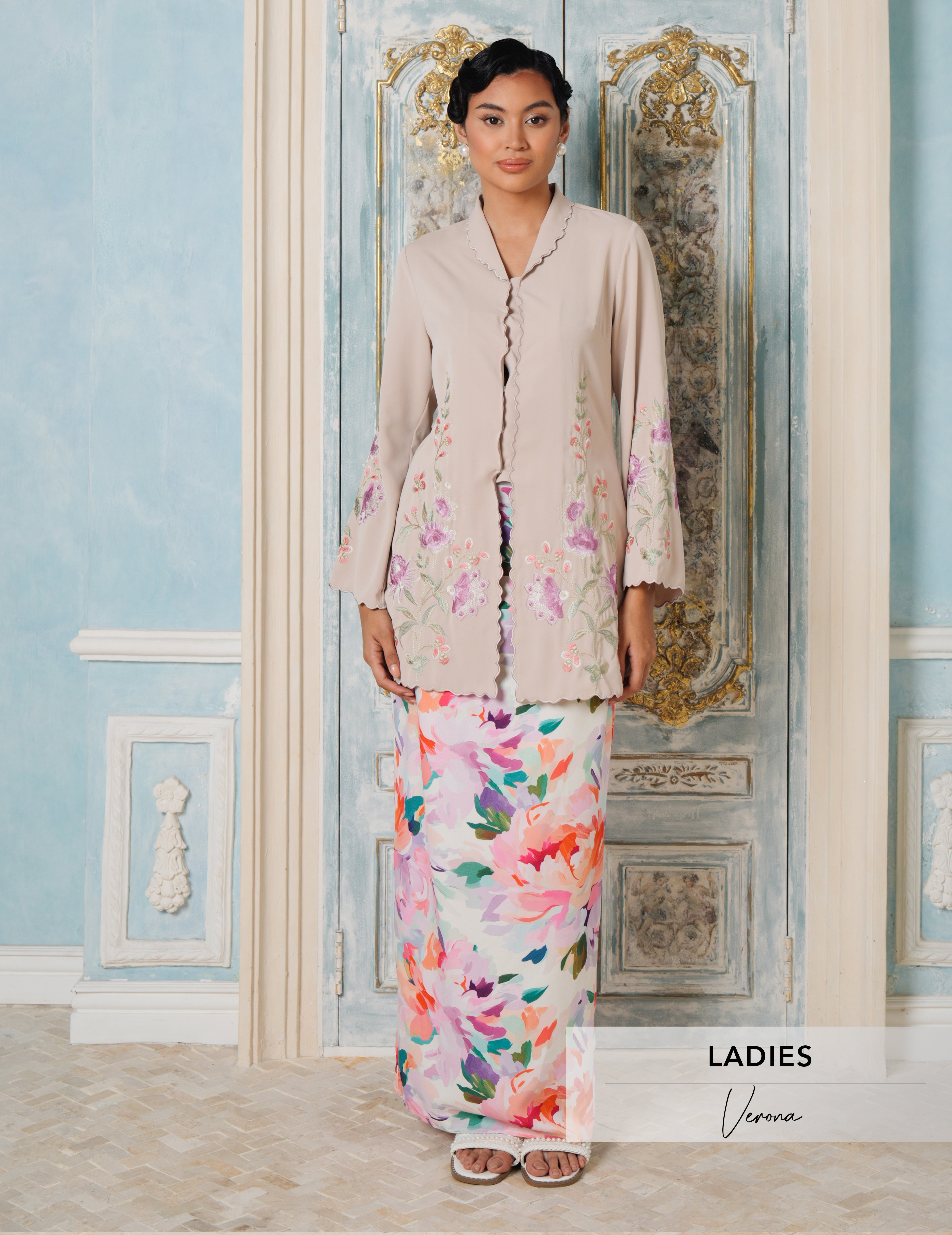 A modern collared kebaya that balances structure and softness, designed to offer the polished look of a traditional kebaya with added ease for Raya. Verona features a classic kebaya front, finished with a concealed back zip for effortless wear.